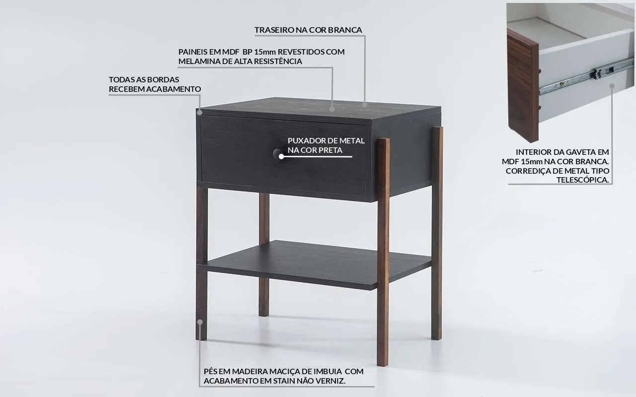 Outro detalhe maravilhoso desta mesinha de cabeceira é que trouxemos para ela pézinhos ripados de madeira maciça com madeira de Imbuia e acabamento encerado, garantindo que os veios e a tonalidade da madeira permaneçam originais.