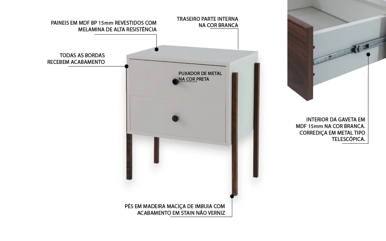 Outro detalhe maravilhoso desta mesinha de cabeceira é que trouxemos para ela pézinhos ripados de madeira maciça com madeira de Imbuia e acabamento encerado, garantindo que os veios e a tonalidade da madeira permaneçam originais.