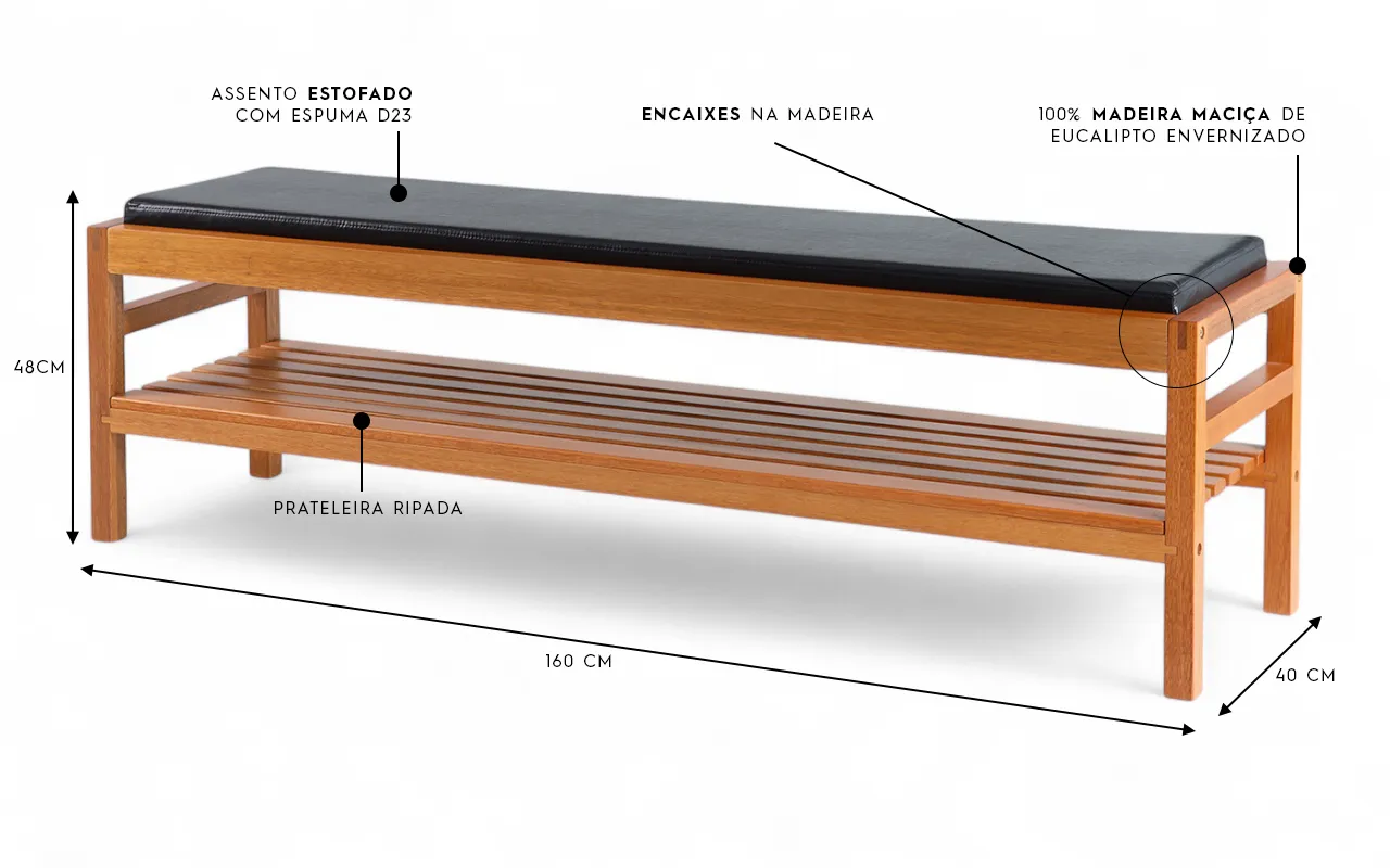 Feito com madeira maciça de eucalipto e acabamento