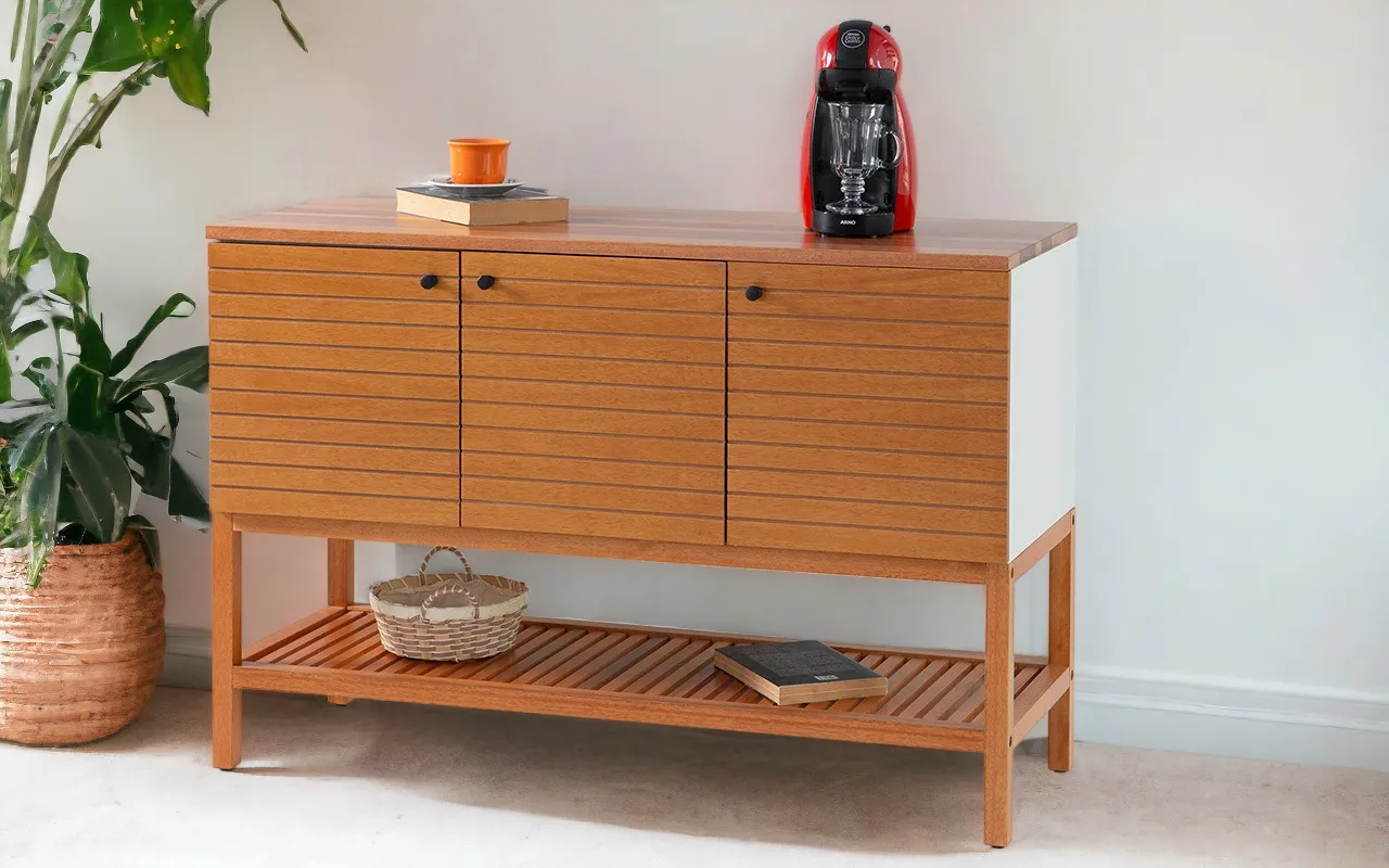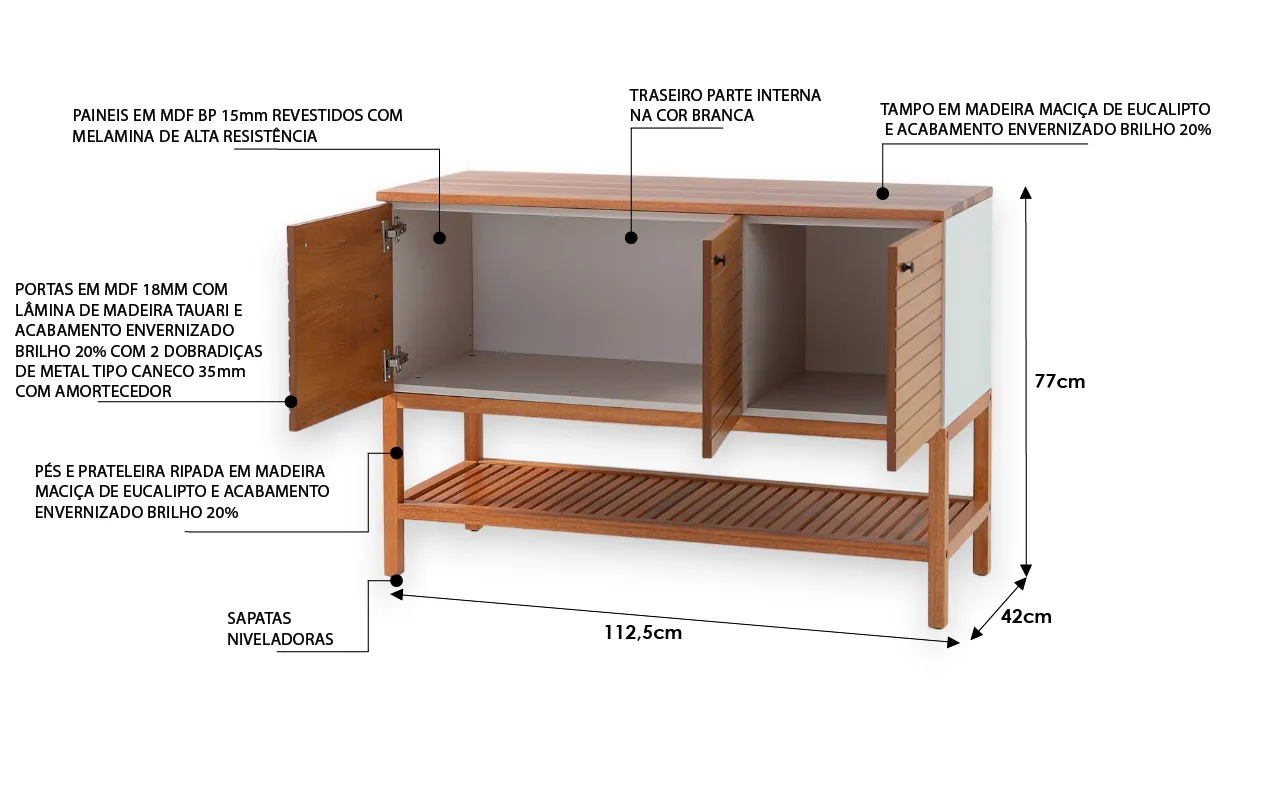 Além disso, as portas da bancada apresentam dobradiças reforçadas e amortecedores integrados, garantindo um fechamento suave e silencioso a cada uso. Os puxadores de metal adicionam um toque de requinte, enquanto os pés com sapatas niveladoras garantem estabilidade em qualquer superfície.