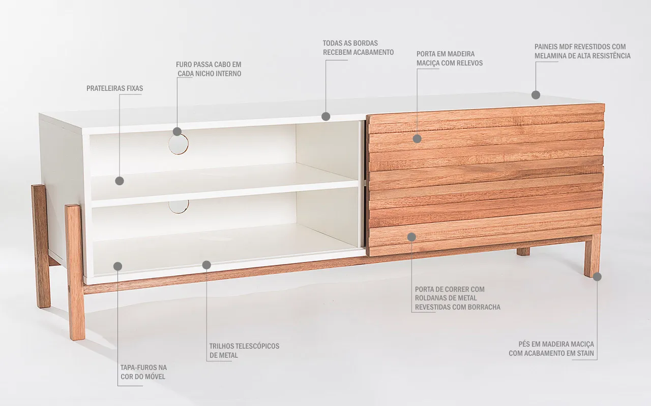 Outro diferencial desse rack branco para tv é a porta de correr com rodinhas de borracha que facilitam o deslizamento. Aliás, a porta de correr desse rack para tv pequeno para quarto é de MADEIRA MACIÇA mesmo, de verdade!!!