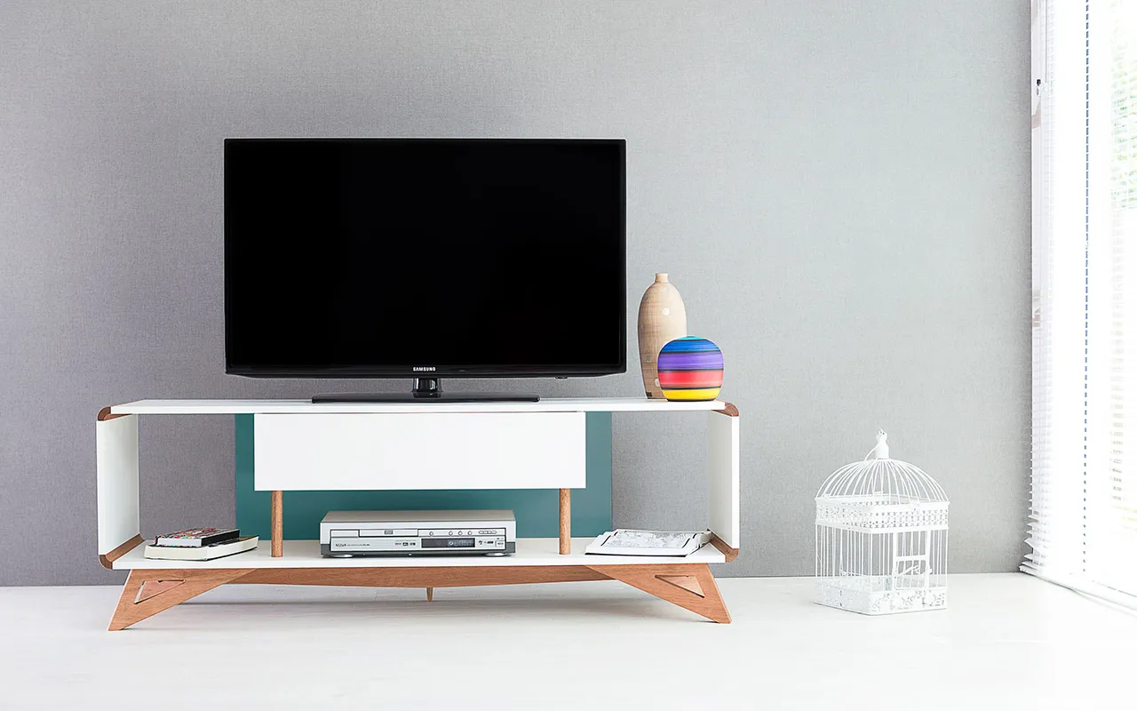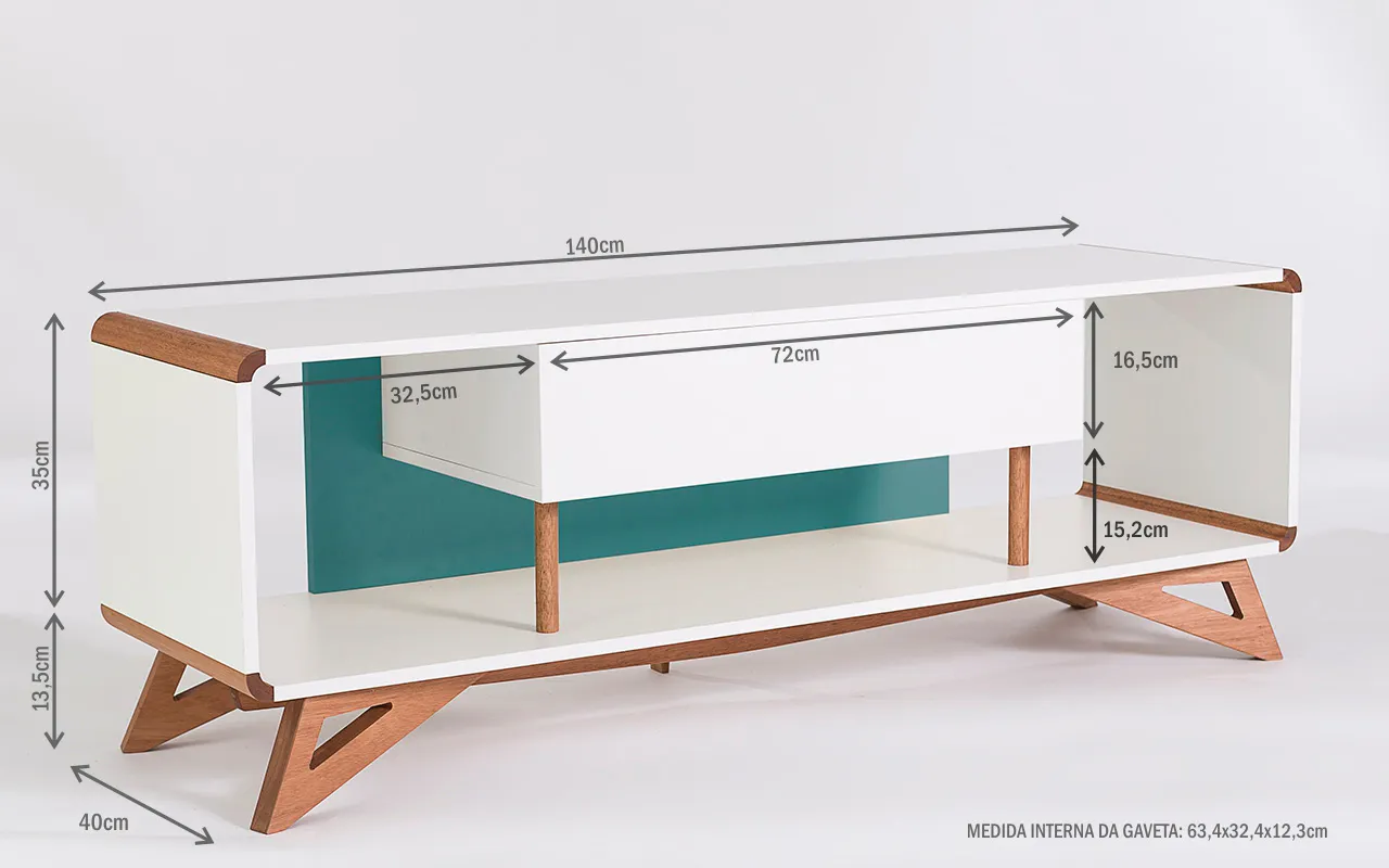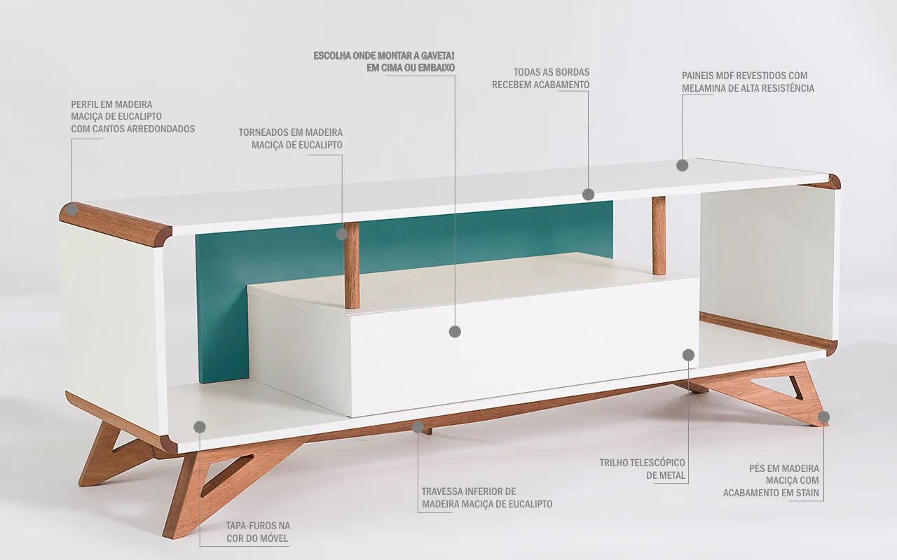 Este rack colorido para TV possui uma prateleira fixa e uma gaveta, que pode ser montada na parte superior ou inferior do rack. Aliás a gaveta possui trilhos telescópicos de metal para garantir suavidade e eficiência no abre-e-fecha.