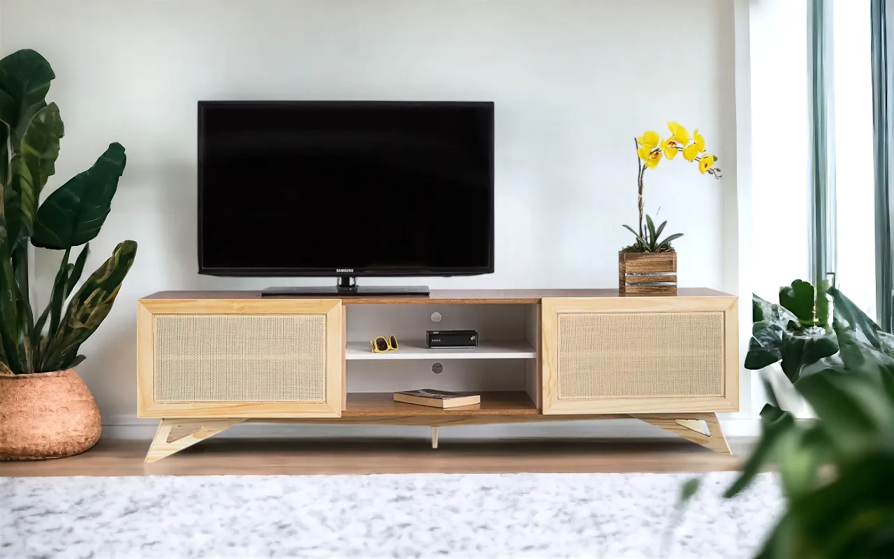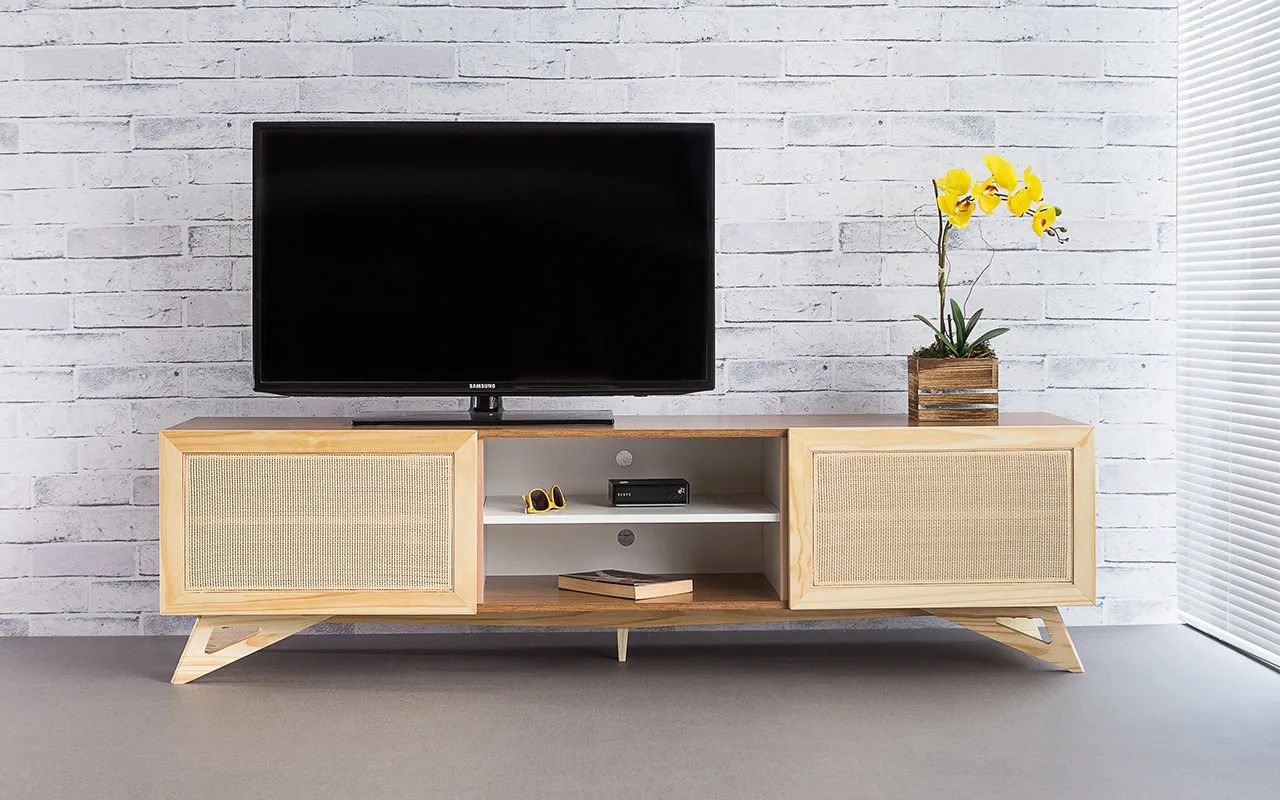 Outro diferencial desse rack freijó para tv são as duas portas, elas são portas com palhinha natural e bordas em madeira maciça taeda (de verdade mesmo), as quais recebem acabamento natural, ressaltando os veios da madeira com muita personalidade! Um rack com portas de palhinha é um verdadeiro charme na sala né? Utilize-o também como um rack tv para sala pequena.