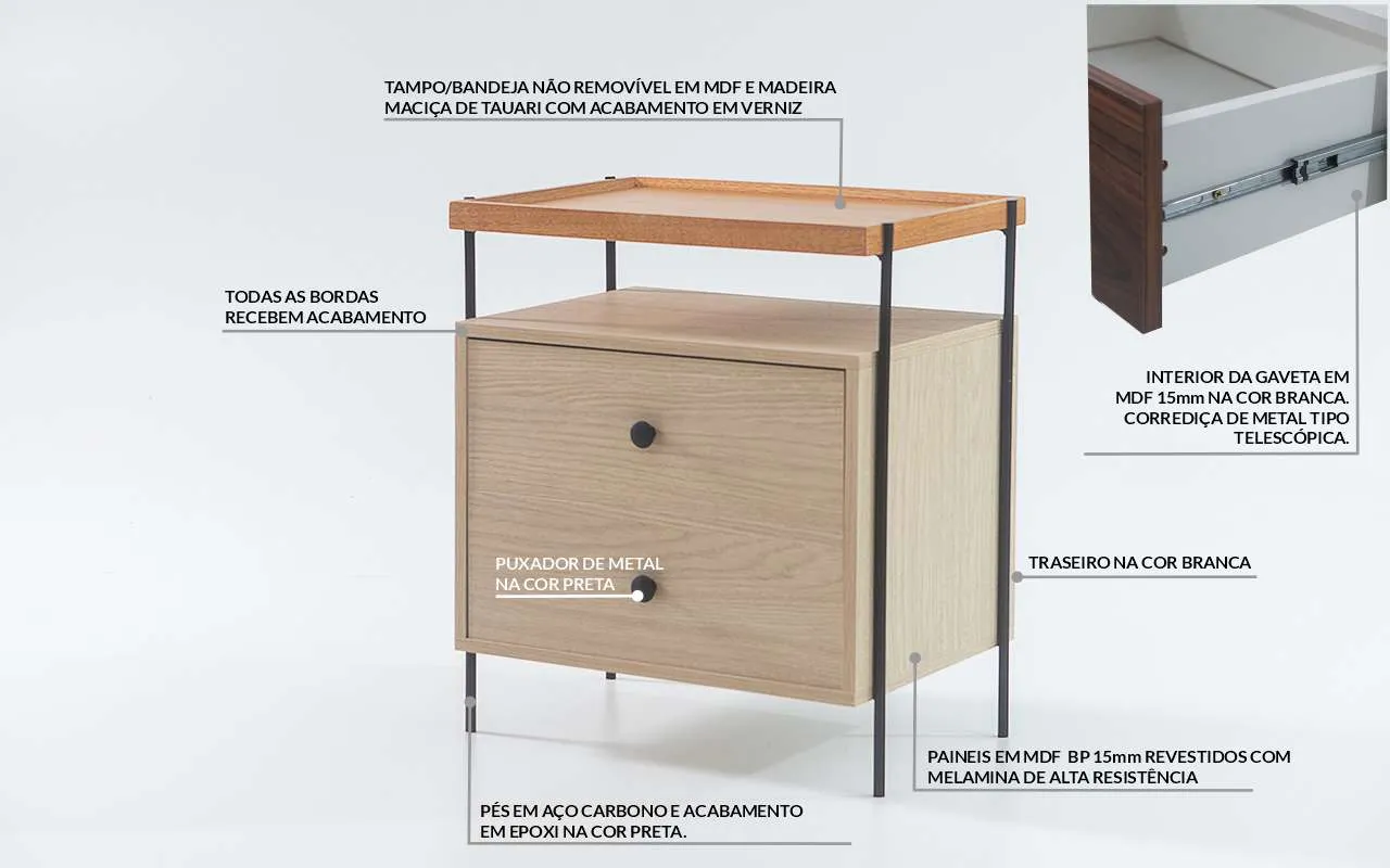 A mesa de cabeceira Tray é composta por uma estrutura em MDF 15mm BP de alta qualidade, em doze opções de cores. Frequentemente o MDF é confundido com o MDP, outro material muito usado na fabricação de móveis, porém o MDP é totalmente diferente na sua integridade e qualidade, sendo pouco resistente e dando um acabamento muito inferior aos produtos.