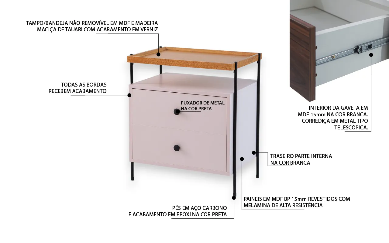 A mesa de cabeceira Tray é composta por uma estrutura em MDF 15mm BP de alta qualidade, em doze opções de cores. Frequentemente o MDF é confundido com o MDP, outro material muito usado na fabricação de móveis, porém o MDP é totalmente diferente na sua integridade e qualidade, sendo pouco resistente e dando um acabamento muito inferior aos produtos.