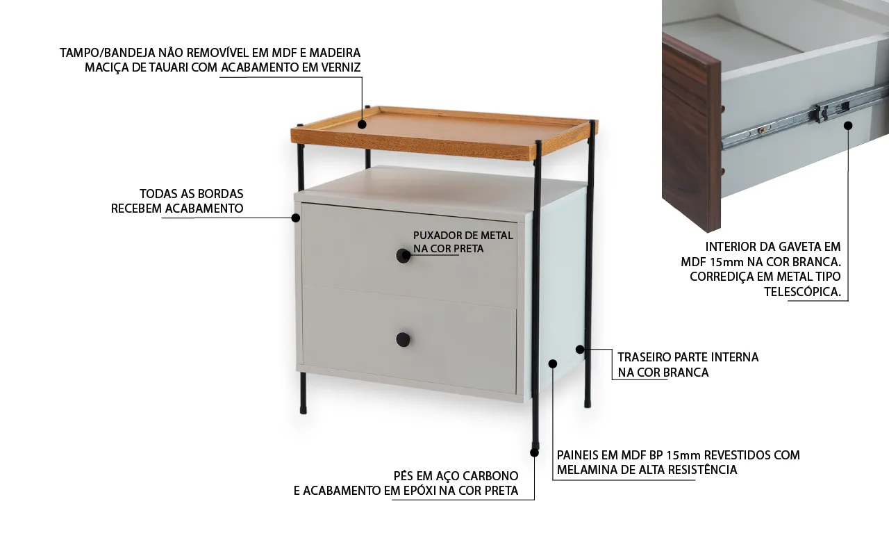 A mesa de cabeceira Tray é composta por uma estrutura em MDF 15mm BP de alta qualidade, em doze opções de cores. Frequentemente o MDF é confundido com o MDP, outro material muito usado na fabricação de móveis, porém o MDP é totalmente diferente na sua integridade e qualidade, sendo pouco resistente e dando um acabamento muito inferior aos produtos.