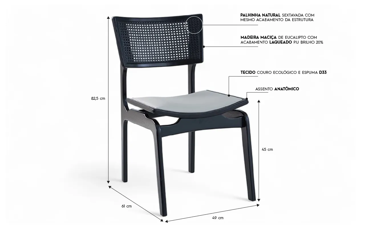 O assento é totalmente ergonômico e estofado com espuma D33, o que garante bastante conforto para longas conversas em volta da mesa de jantar.