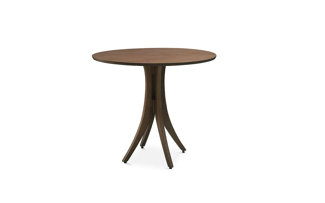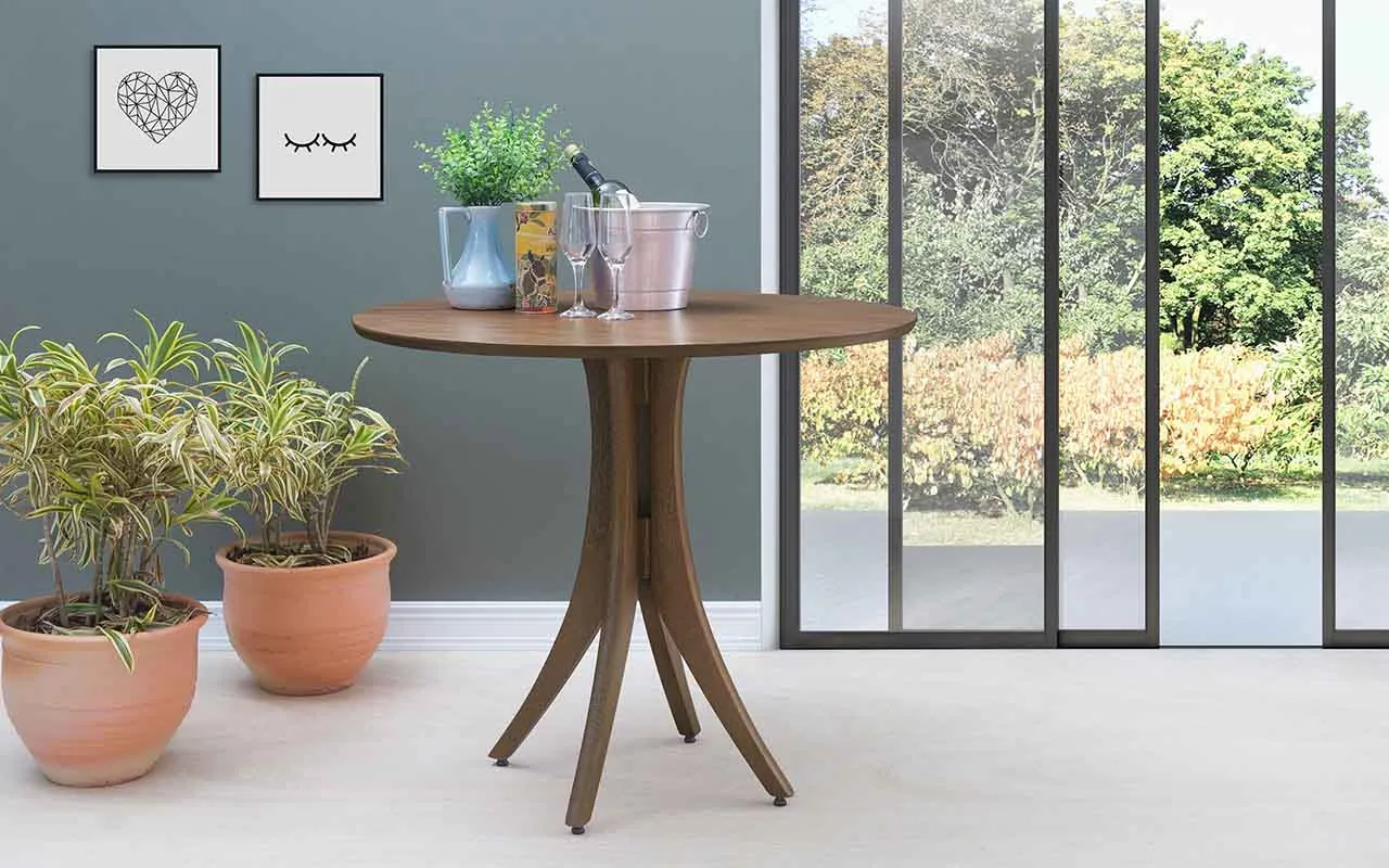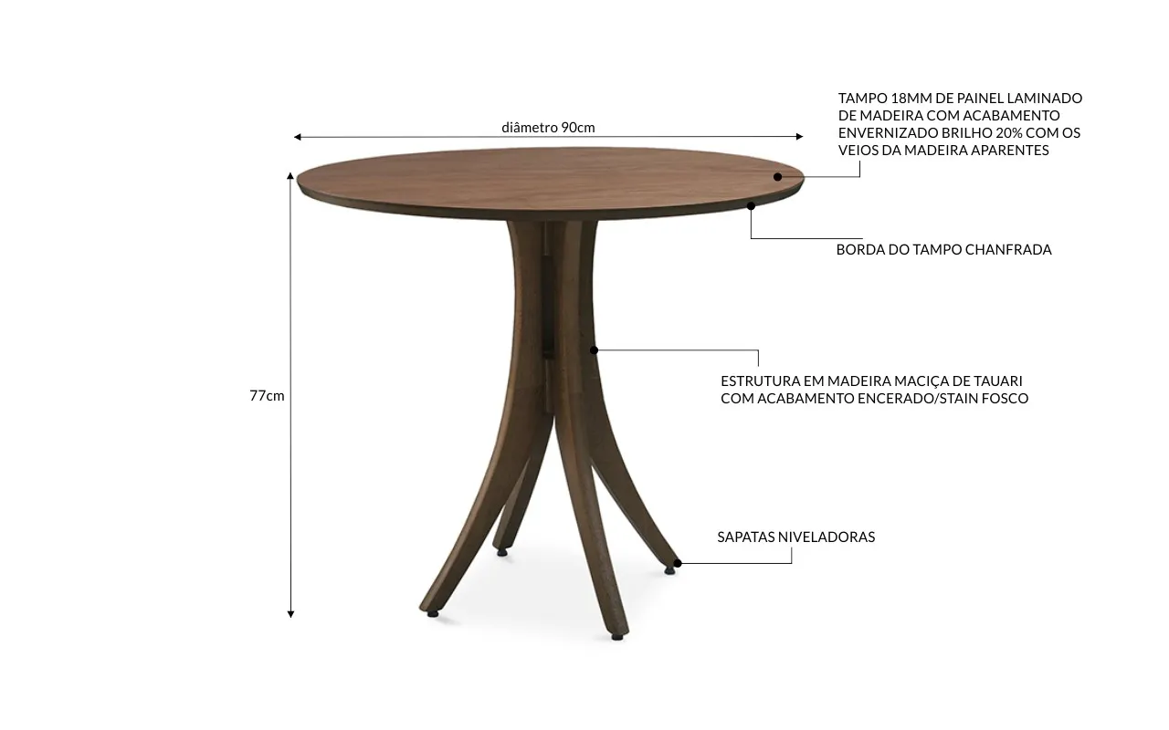Os pés desta mesa bistrô redonda Juliette recebem acabamento encerado, com stain impregnante fosco que protege a madeira contra umidade, insetos e permite que os veios da madeira fiquem aparentes.