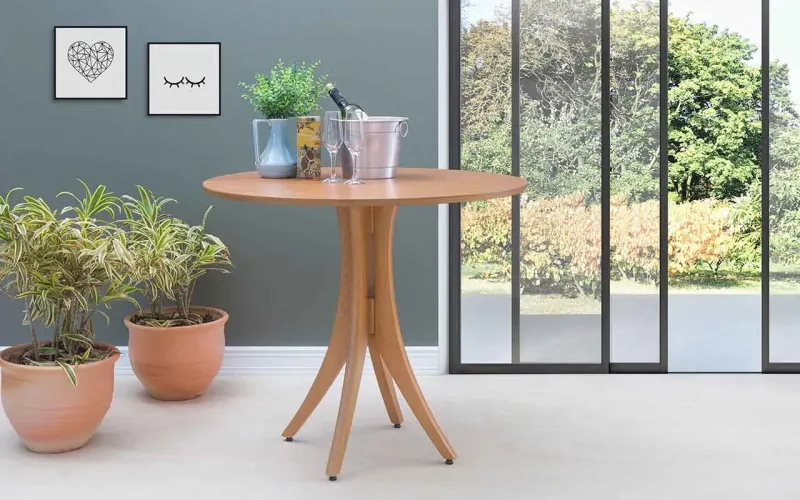 Os pés desta mesa bistrô redonda Juliette recebem acabamento encerado, com stain impregnante fosco que protege a madeira contra umidade, insetos e permite que os veios da madeira fiquem aparentes.