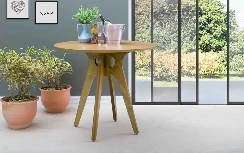 Os pés desta mesa bistrô redonda Bianchi recebem acabamento envernizado