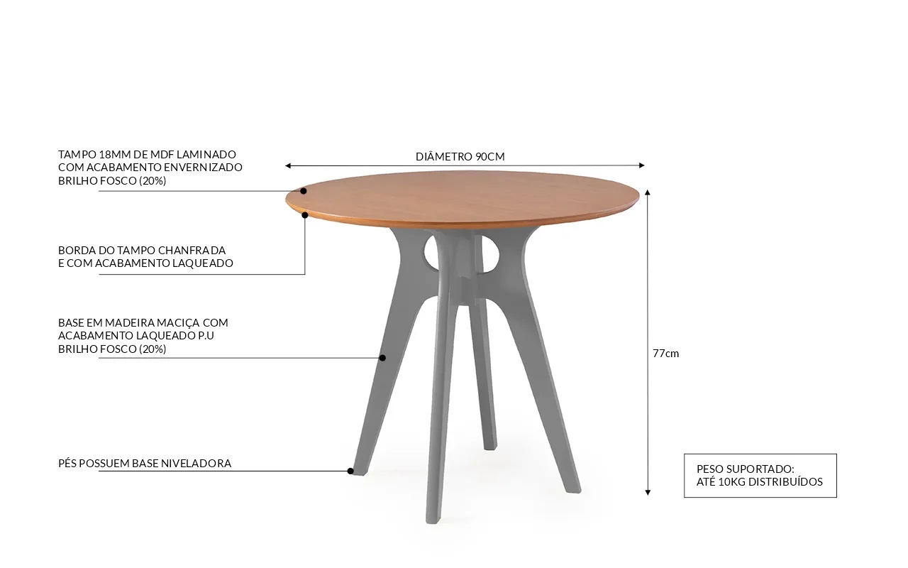 Os pés desta mesa bistrô redonda Bianchi recebem acabamento laqueado P.U brilho 20% (fosco) de alta cobertura e resistência ao amarelamento natural.