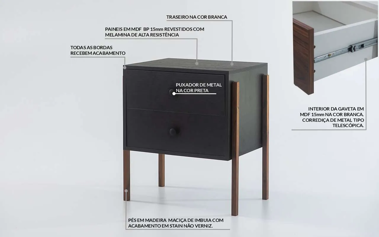 Outro detalhe maravilhoso desta mesinha de cabeceira é que trouxemos para ela pézinhos ripados de madeira maciça com madeira de Imbuia e acabamento encerado, garantindo que os veios e a tonalidade da madeira permaneçam originais.