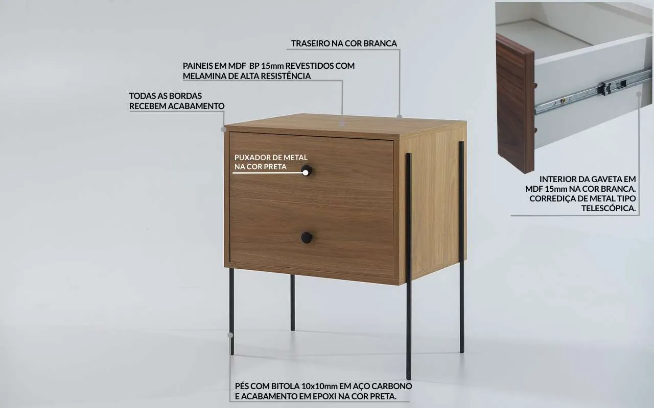 Outro detalhe maravilhoso desta mesinha de cabeceira é que trouxemos para ela pézinhos de aço carbono com acabamento em époxi na cor preta.