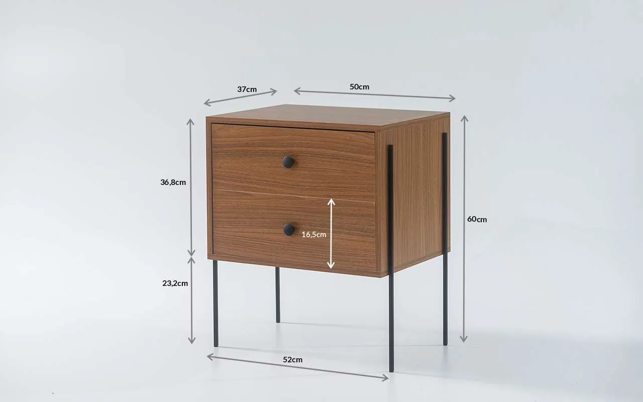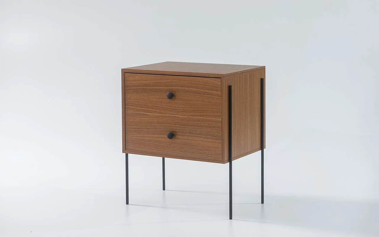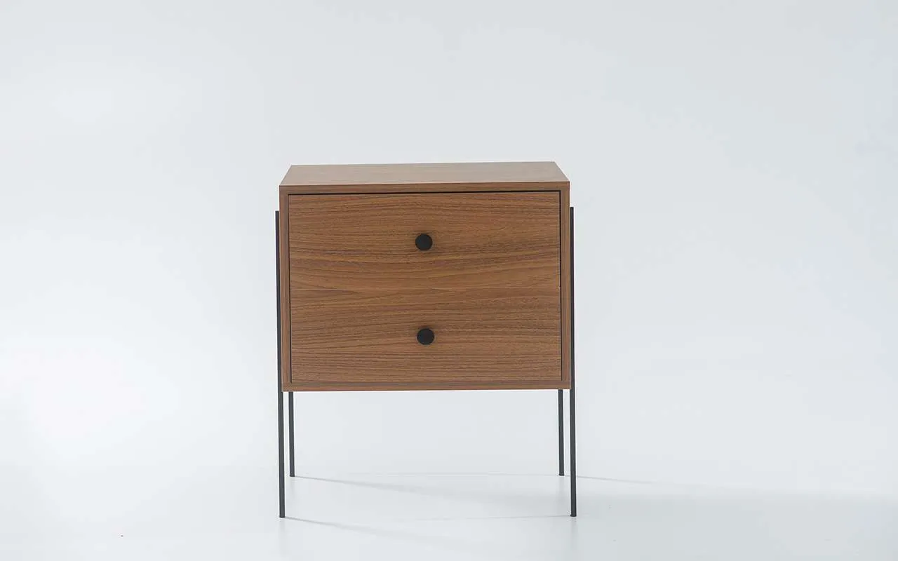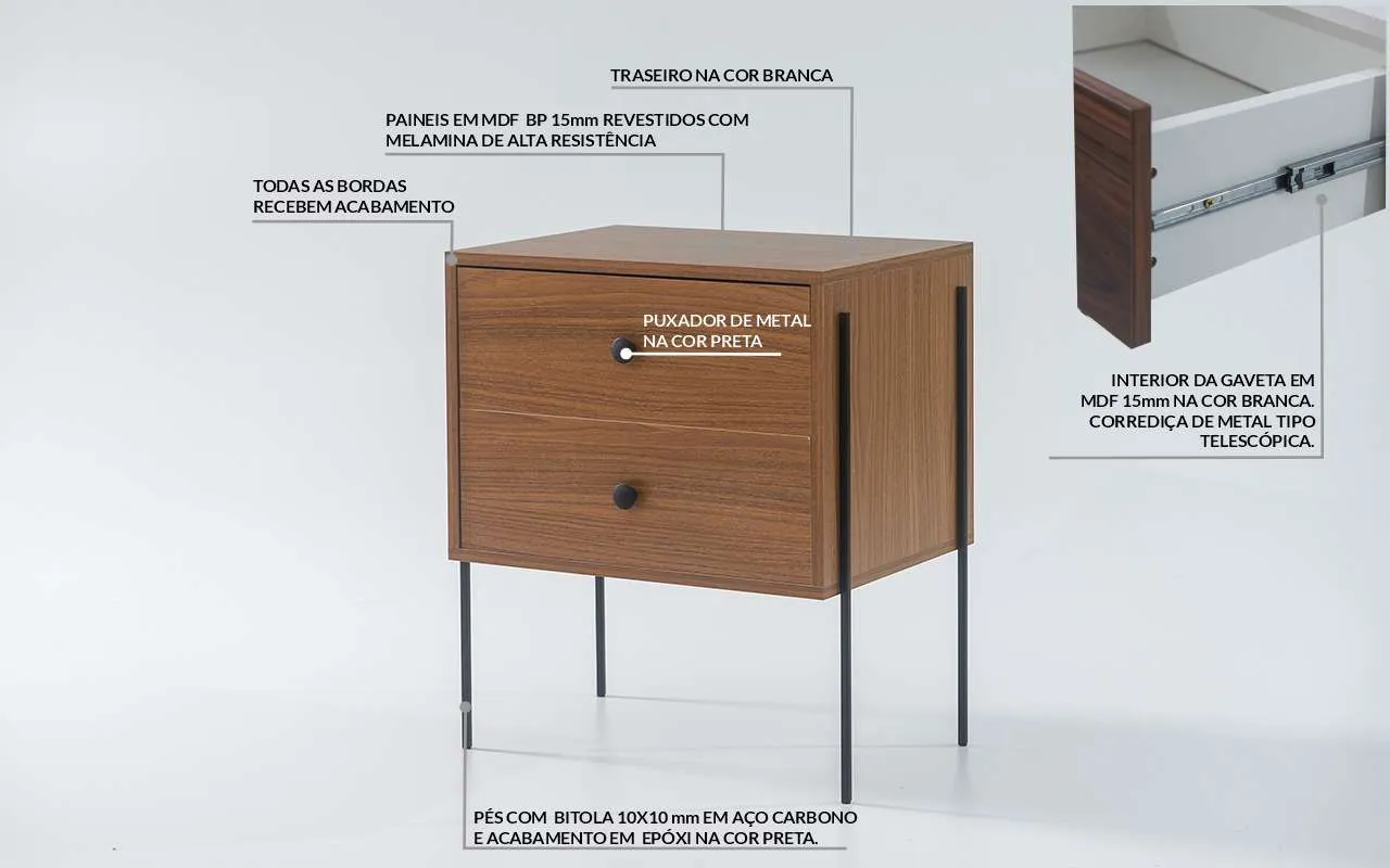 Outro detalhe maravilhoso desta mesinha de cabeceira é que trouxemos para ela pézinhos de aço carbono com acabamento em époxi na cor preta.