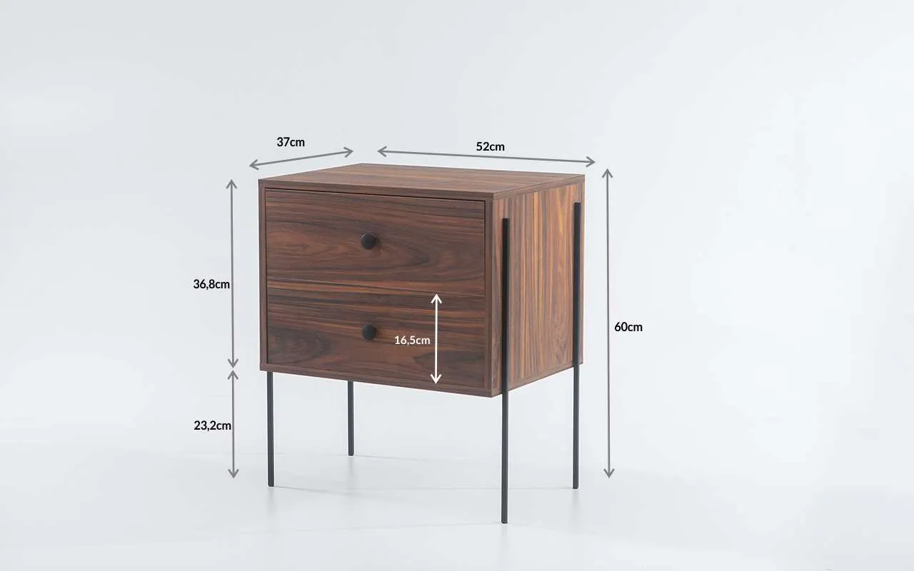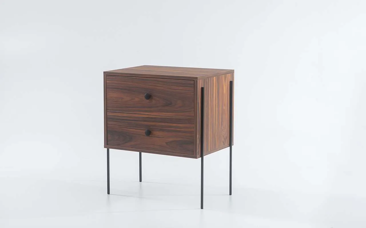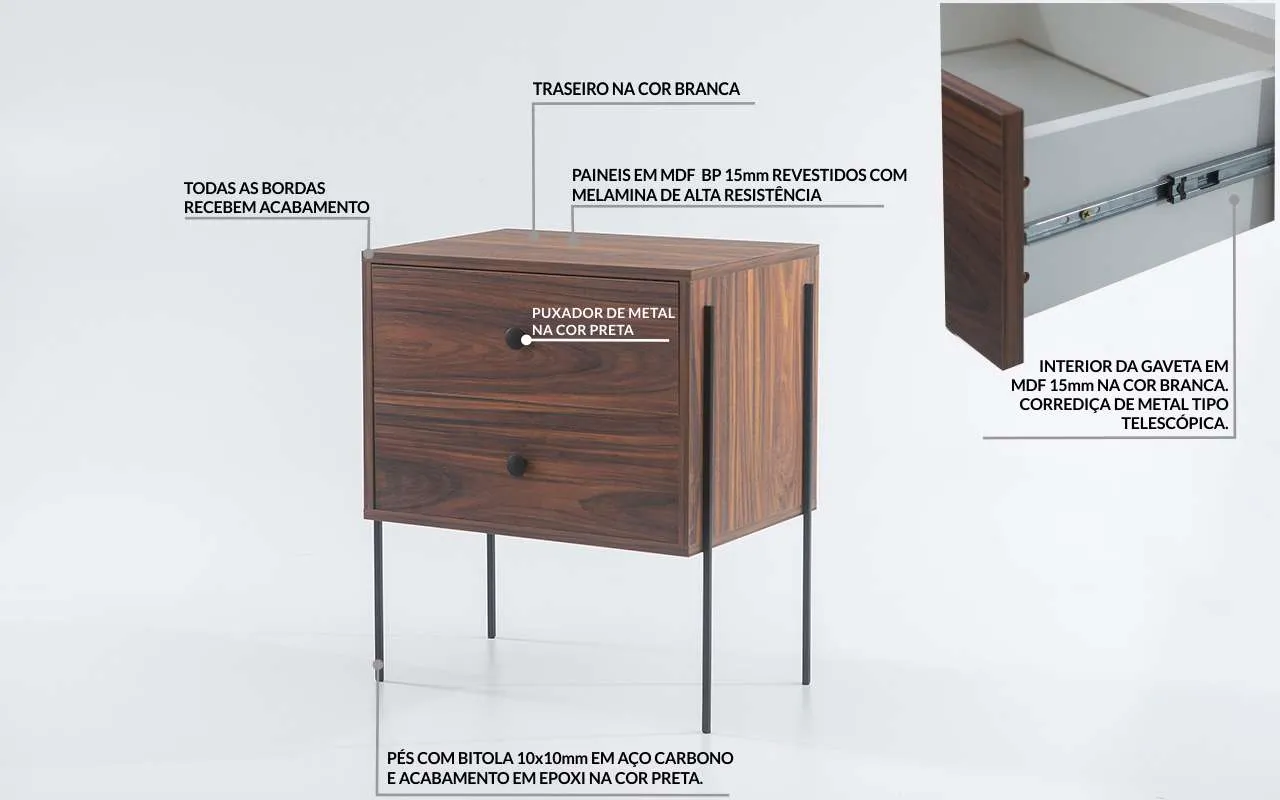 Outro detalhe maravilhoso desta mesinha de cabeceira é que trouxemos para ela pézinhos de aço carbono com acabamento em époxi na cor preta.