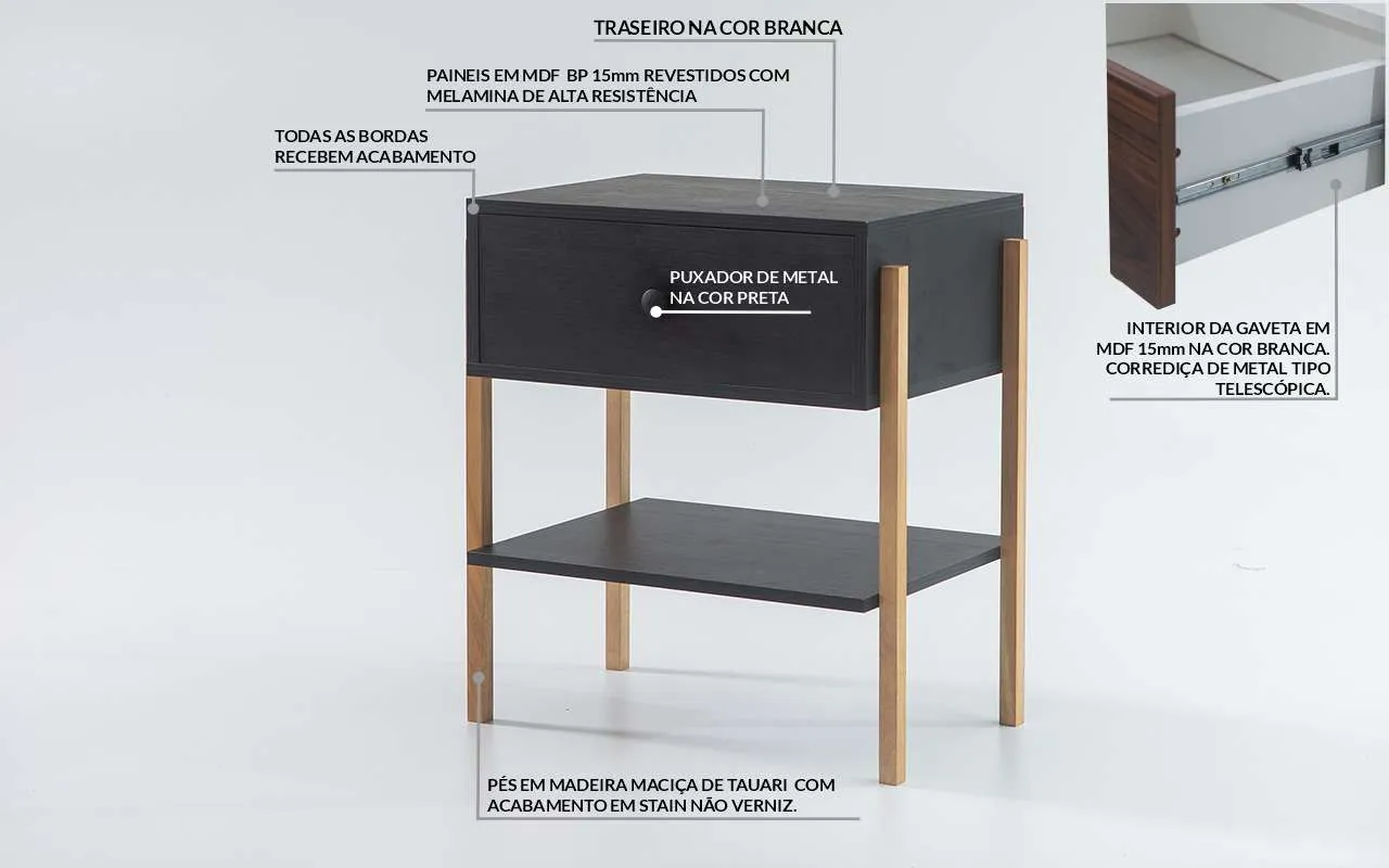 Outro detalhe maravilhoso desta mesinha de cabeceira é que trouxemos para ela pézinhos ripados de madeira maciça com madeira de Tauari e acabamento encerado, garantindo que os veios e a tonalidade da madeira permaneçam originais.