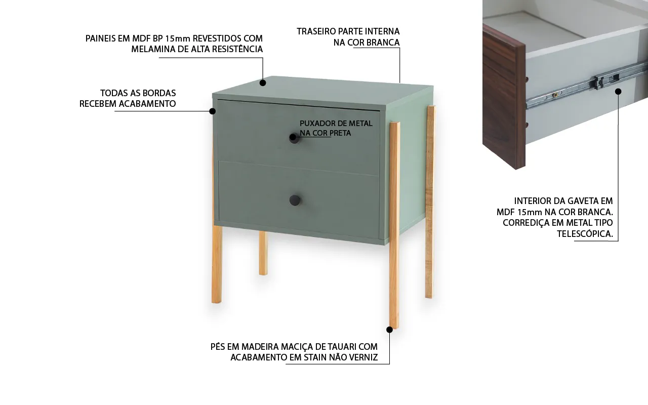 Outro detalhe maravilhoso desta mesinha de cabeceira é que trouxemos para ela pézinhos ripados de madeira maciça com madeira de Tauari e acabamento encerado, garantindo que os veios e a tonalidade da madeira permaneçam originais.