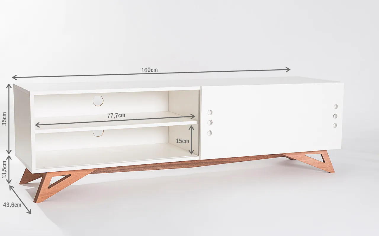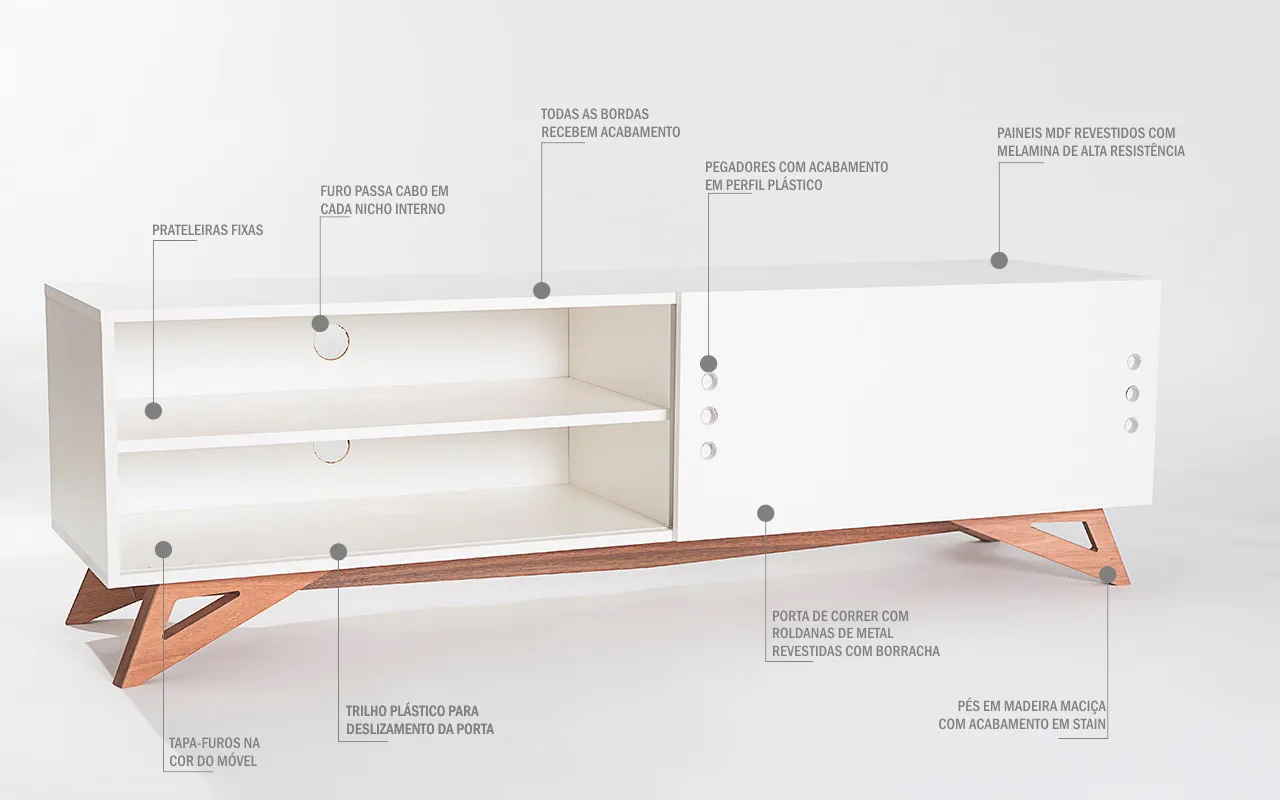 Os pés desse rack para tv retrô são de madeira maciça mesmo!!! Este rack para sala com pés de madeira é um rack contemporâneo com pés de madeira em estilo retrô que além de descontrair, vai levar personalidade para sua sala de tv ou quarto. É uma excelente opção de rack para salas pequenas ou rack branco para quarto.