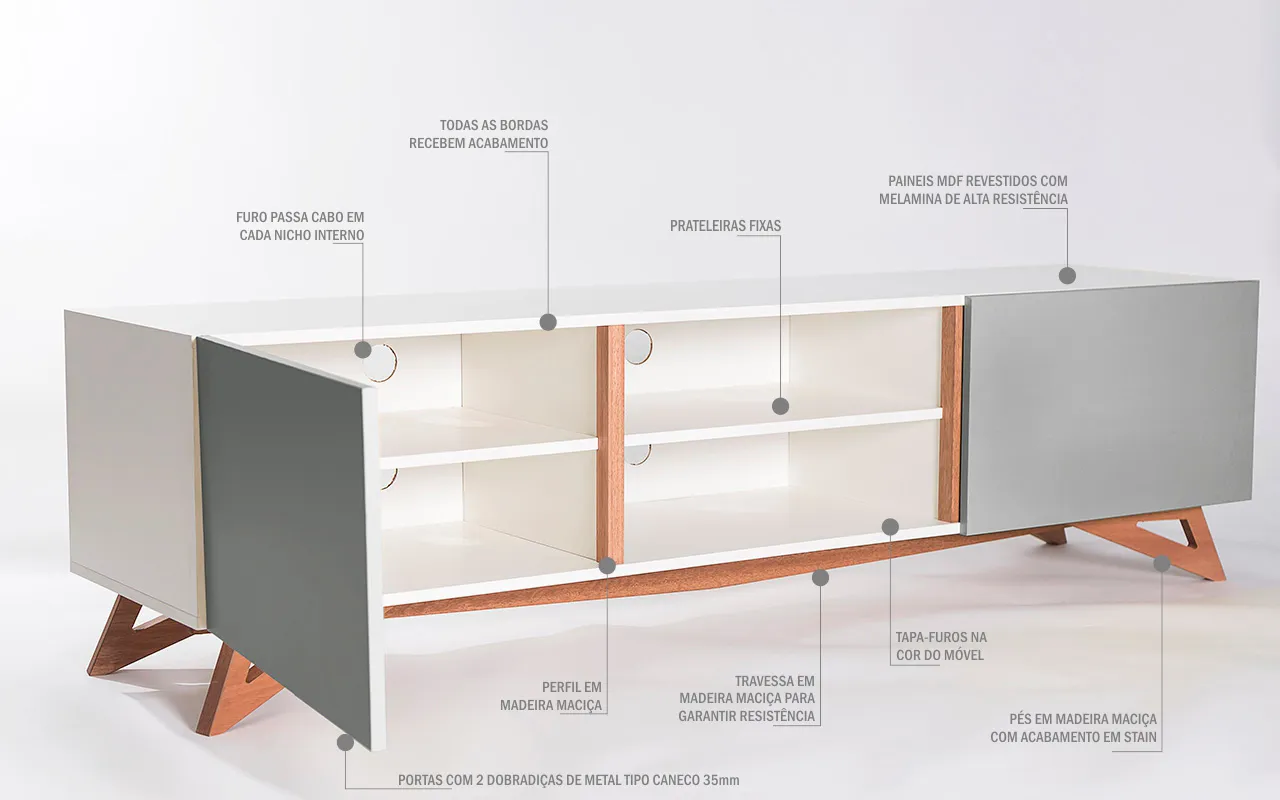 Este móvel para TV tem acabamento “top”, olha só: Este rack para tv design tem todas as bordas traseiras também acabadas com revestimento em melamina de alta resistência. Assim, esse rack tv vintage não vai sofrer com a umidade e terá grande durabilidade.