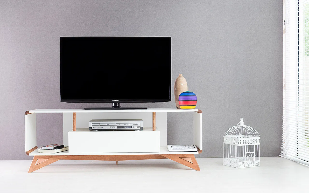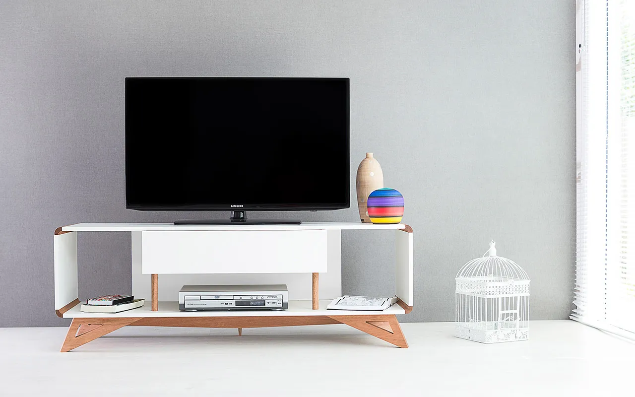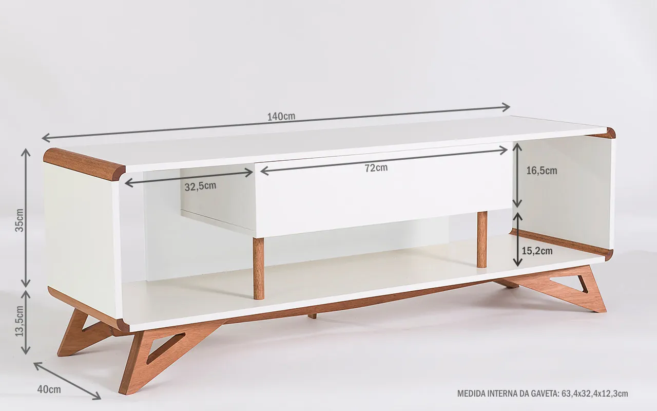 Os pés desse rack para tv retrô são de madeira maciça mesmo!!! Este rack para sala com pés de madeira é um rack contemporâneo com pés de madeira em estilo retrô que além de descontrair, vai levar personalidade para sua sala de tv ou quarto. É uma excelente opção de rack para salas pequenas ou rack branco para quarto.