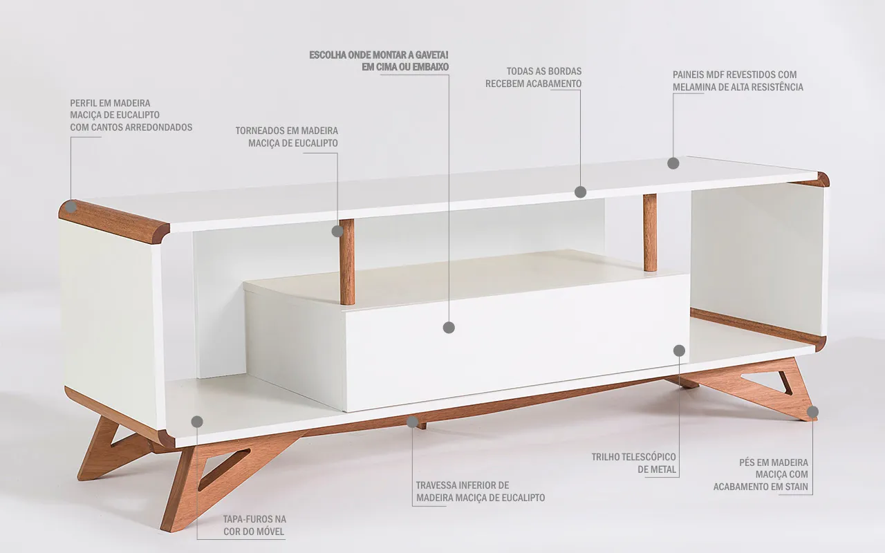 Outro diferencial desse rack branco para tv são os cantos arredondados em madeira maciça de verdade que, somados aos torneados (também de madeira maciça de verdade) e a altura desse rack de TV um pouco mais baixa, dão a tônica da personalidade anos 60 à esse móvel TV!