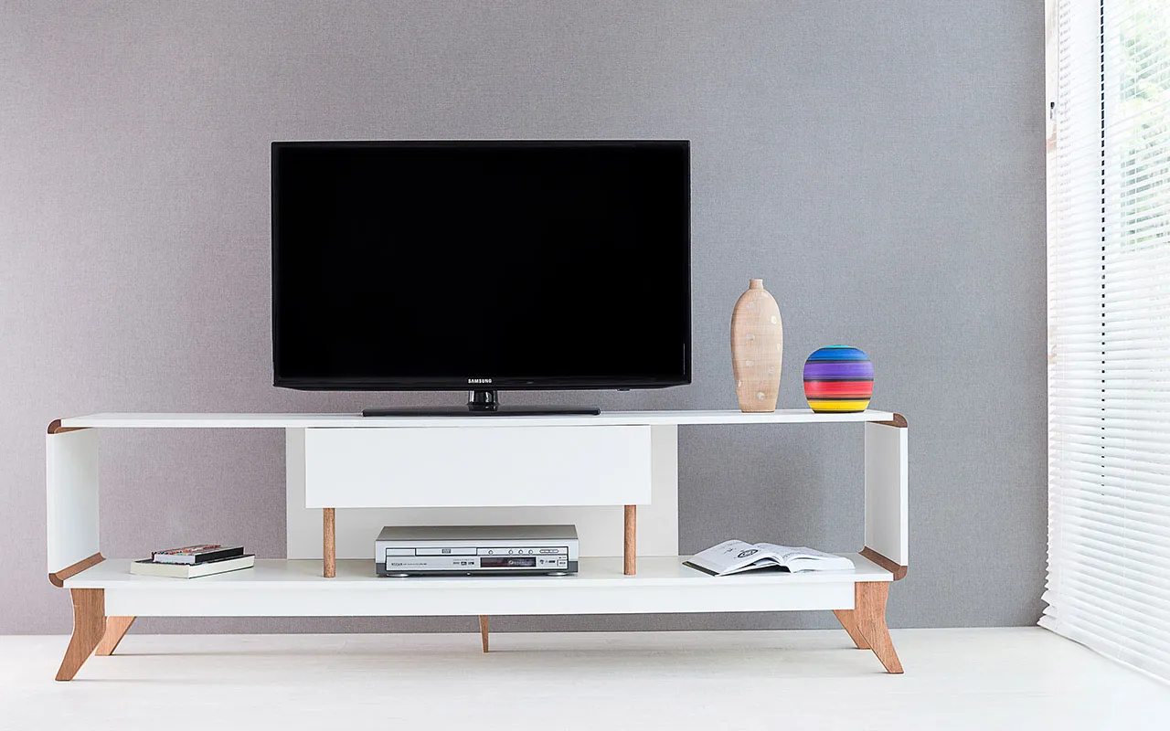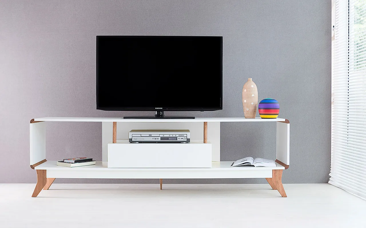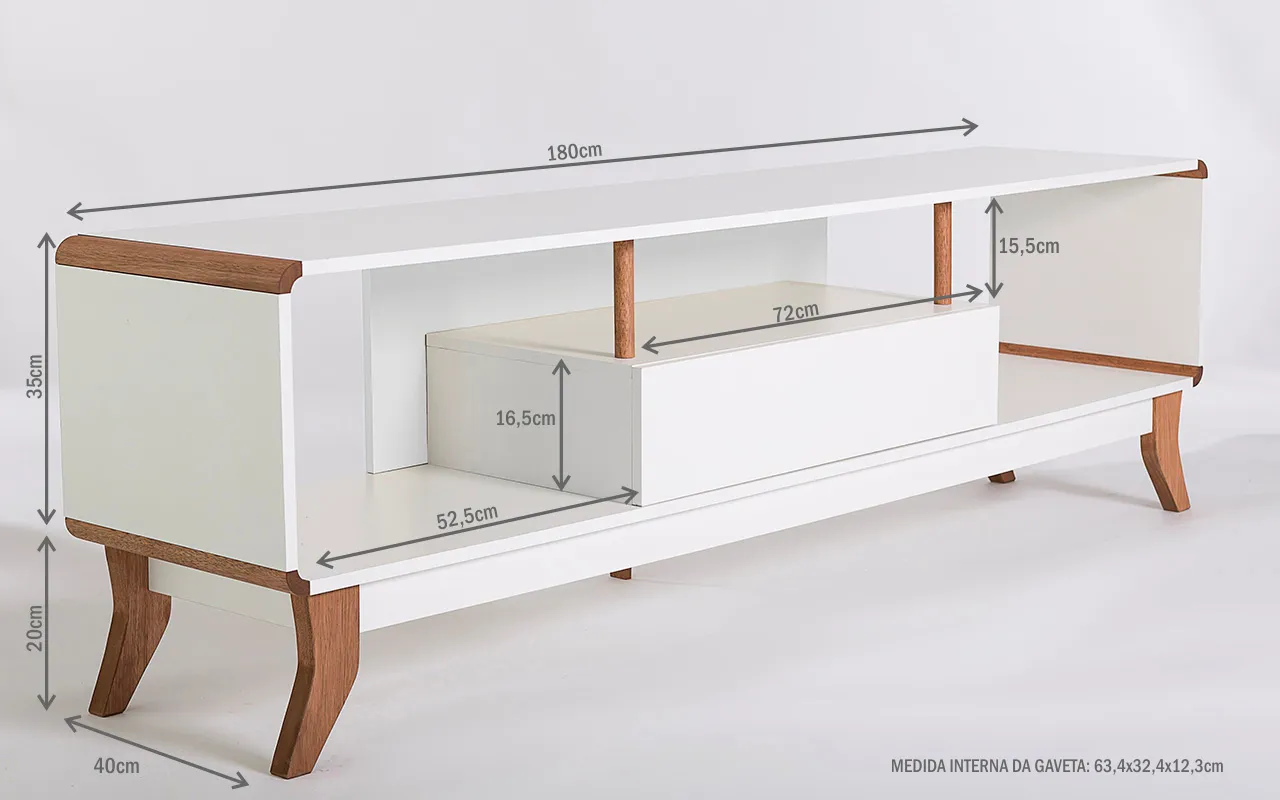 Os pés desse rack para tv retrô são de madeira maciça mesmo!!! Este rack para sala com pés de madeira é um rack contemporâneo com pés de madeira em estilo retrô que além de descontrair, vai levar personalidade para sua sala de tv ou quarto. É uma excelente opção de rack para salas pequenas ou rack branco para quarto.