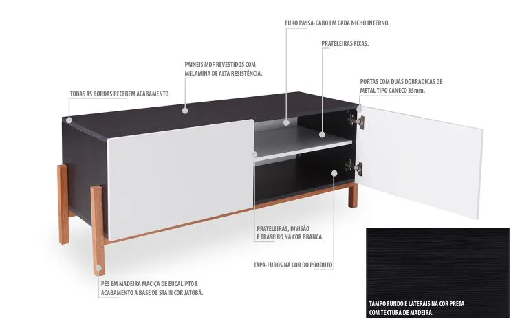 Este móvel para TV tem um excelente acabamento: Este rack para tv design tem todas as bordas traseiras também acabadas com revestimento em melamina de alta resistência. Assim, esse rack preto tv vintage não vai sofrer com a umidade e terá grande durabilidade.