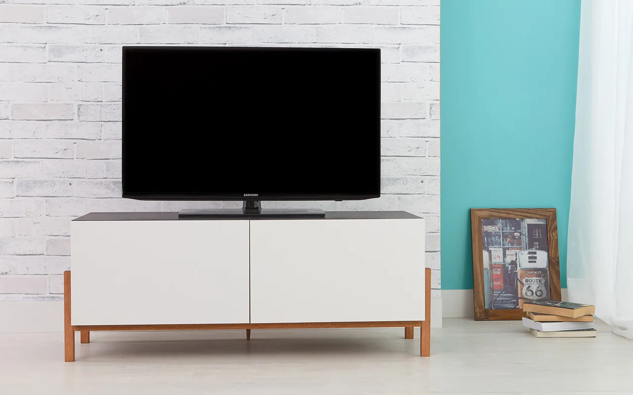 Este rack para tv preto com 2 portas BRANCAS é construído em mdf revestido com melamina de alta resistência a riscos num lindo padrão texturizado na cor preta! É isso mesmo, tenha seu rack preto num padrão de excelente acabamento estético. Além disso, seus pés são construídos em madeira maciça de Eucalipto com acabamento natural para ressaltar os veios naturais da madeira. Além disso, este rack para tv baixo é de fácil limpeza: basta um pano úmido!