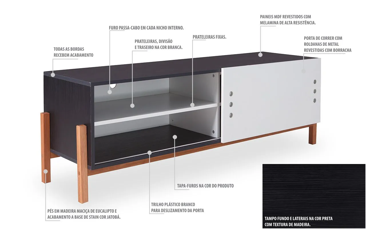 Os pés desse rack para tv retrô são de madeira maciça de Eucalipto mesmo! Este rack preto para sala com pés de madeira é um rack contemporâneo com pés de madeira em estilo retrô que além de descontrair, vai levar personalidade para sua sala de tv ou quarto. É uma excelente opção de rack preto para salas pequenas (utilizar: salas espaçosas nas opções 1,6 e 1,8) ou rack para quarto.