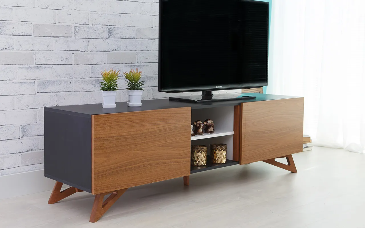 Este móvel para TV tem um excelente acabamento: Este rack para tv design tem todas as bordas traseiras também acabadas com revestimento em melamina de alta resistência. Assim, esse rack preto tv vintage não vai sofrer com a umidade e terá grande durabilidade.
