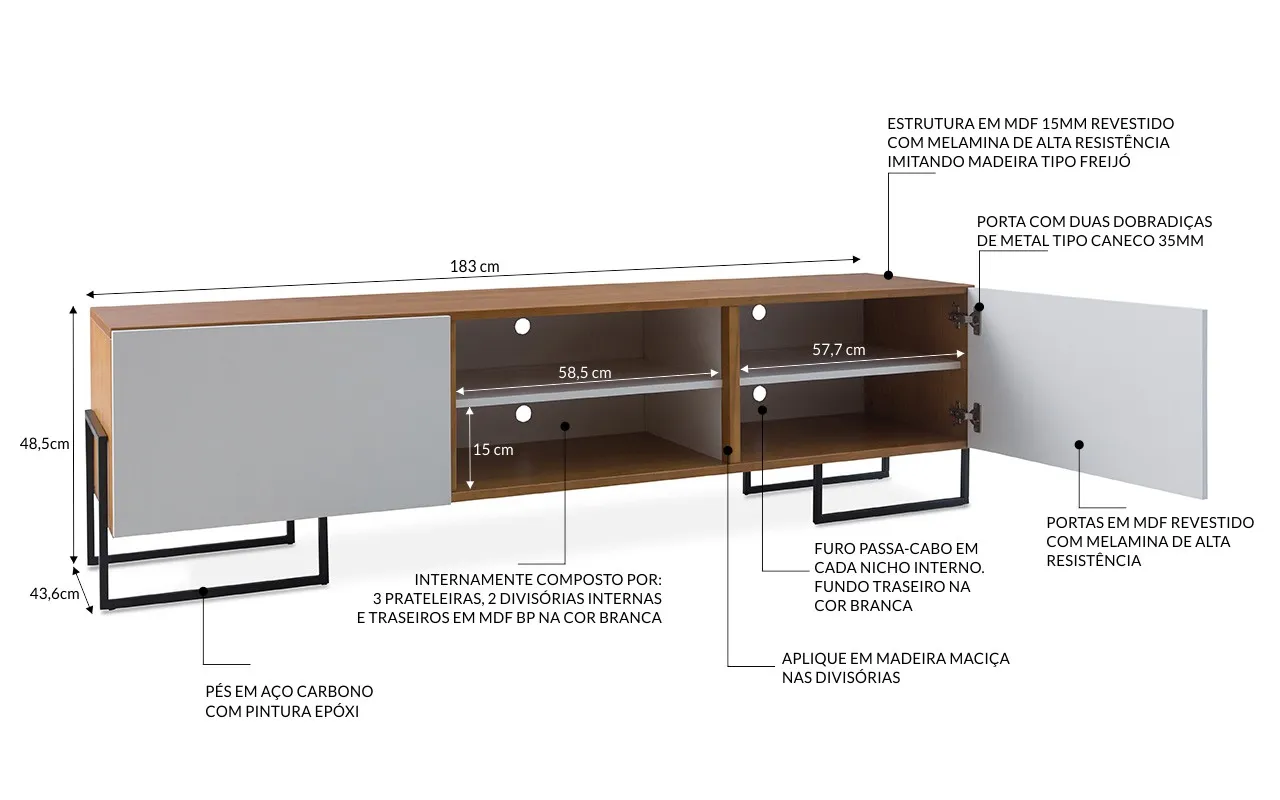 As peças internas como divisórias, prateleiras e fundo são em MDF 15mm com acabamento BP Branco resistente, não permitindo que nenhuma borda fique aparente, garantindo assim durabilidade e proteção contra mofo.