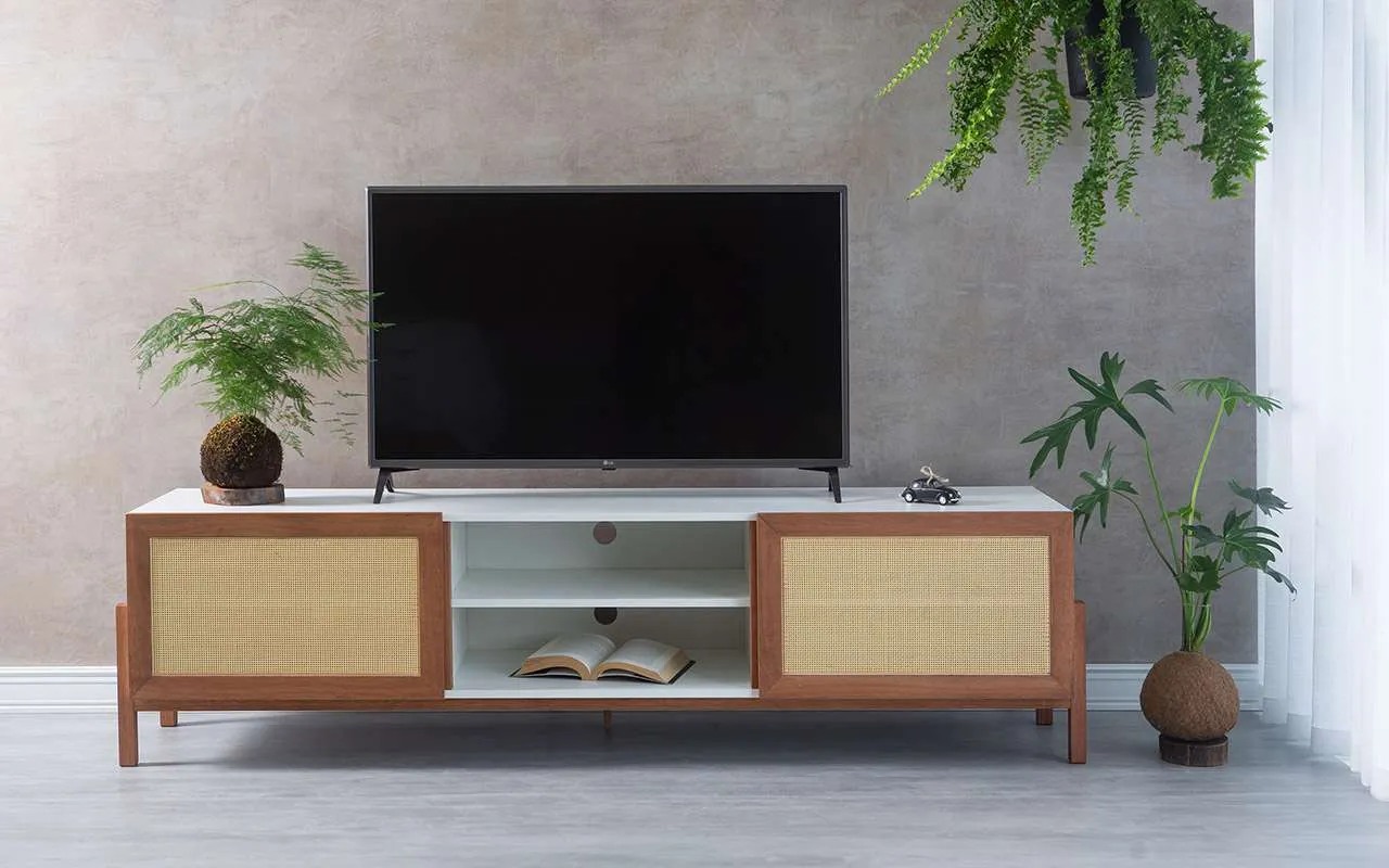 Outro diferencial desse rack branco para tv são as duas portas construída em madeira maciça de Eucalipto com acabamento em stain e rattan. Utilize-o também como um rack tv para sala pequena.