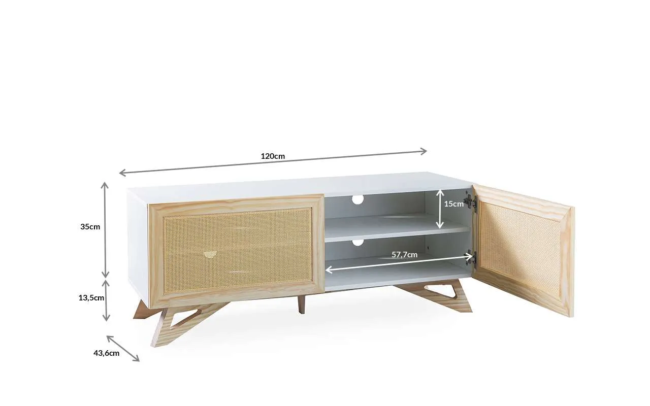 Se você quer descontrair seus ambientes você vai se encantar com o rack para sala branco Freddie, da Woodinn. Este rack para tv com 2 portas TAEDA E RATTAN é construído em mdf revestido com melamina de alta resistência a riscos. Por causa do revestimento em melamina, esse rack para tv branco não irá amarelar com o tempo. Além disso, este rack para tv baixo é de fácil limpeza: basta um pano úmido!