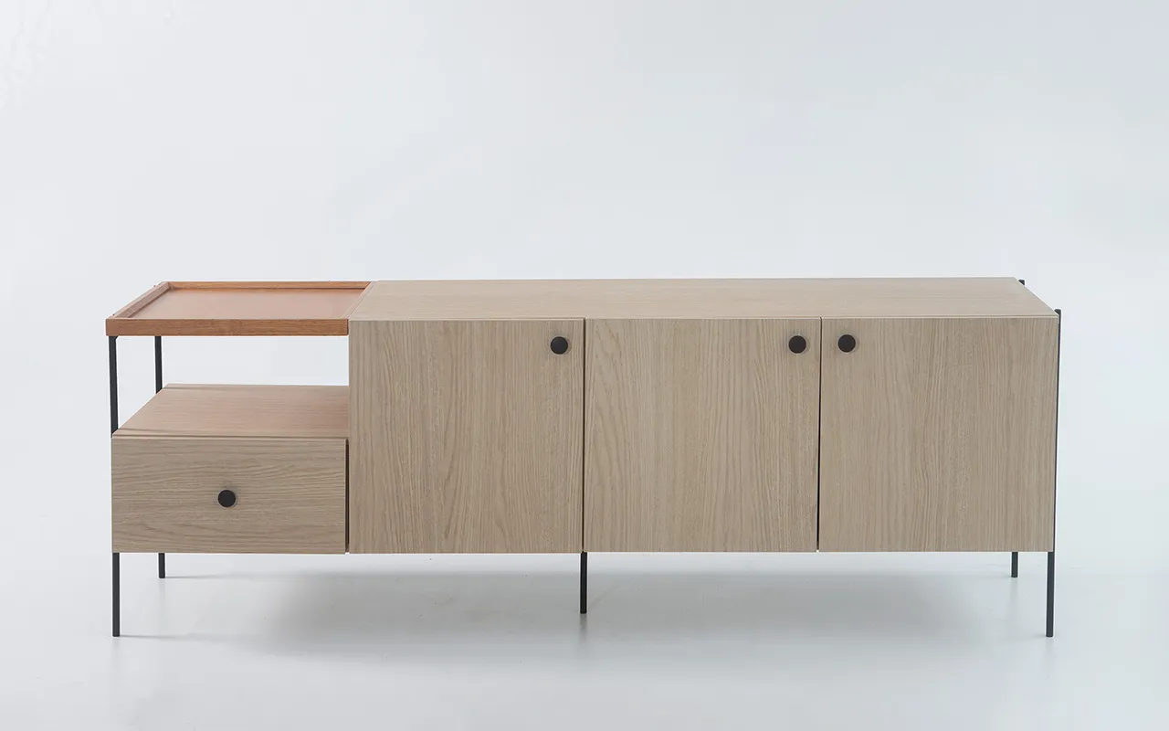 Os pés de aço carbono redondo de 13mm, com pintura epóxi preta, conferem estabilidade e um toque contemporâneo. As dobradiças das portas são de excelente qualidade e vêm com amortecimento para um fechamento suave.