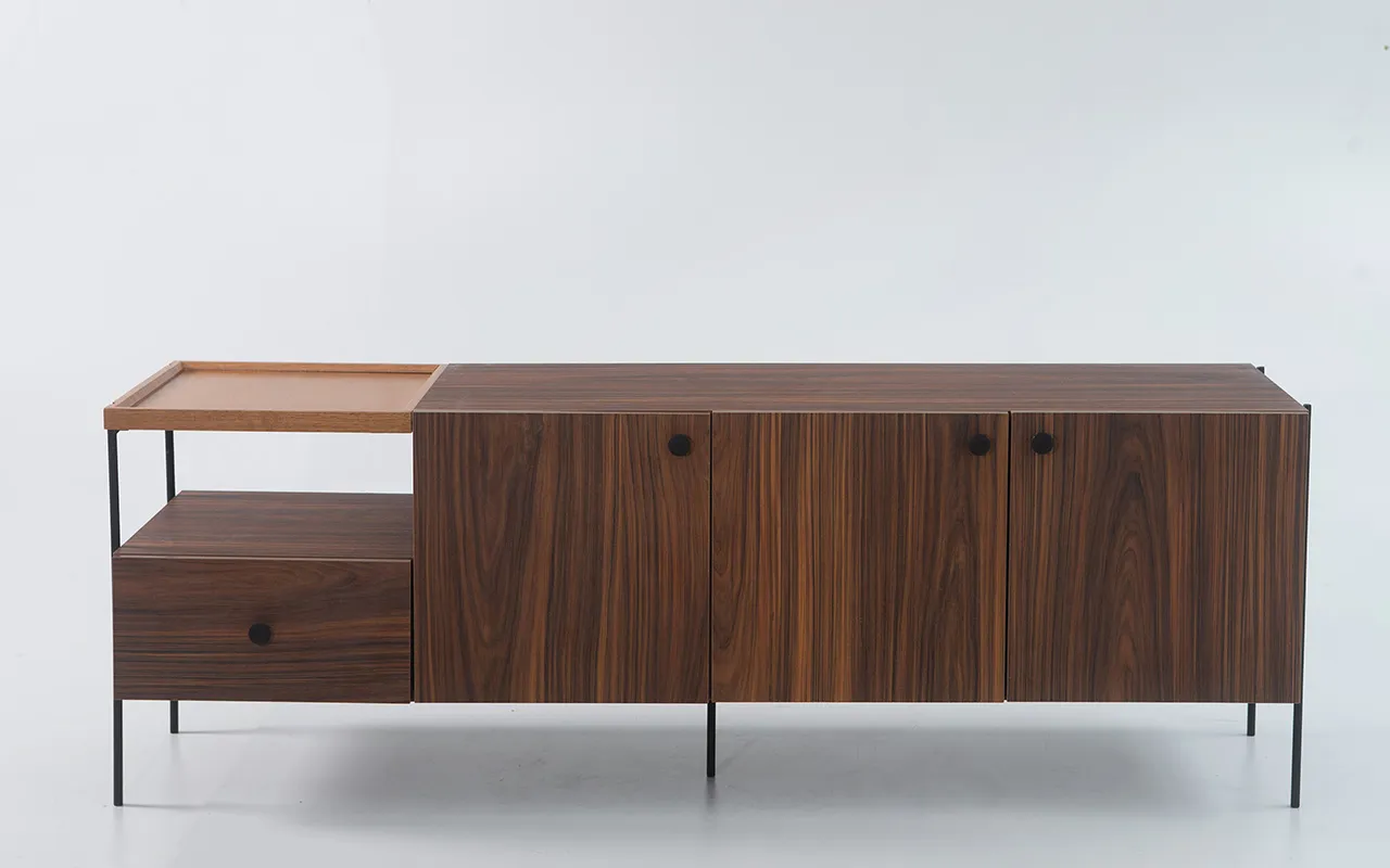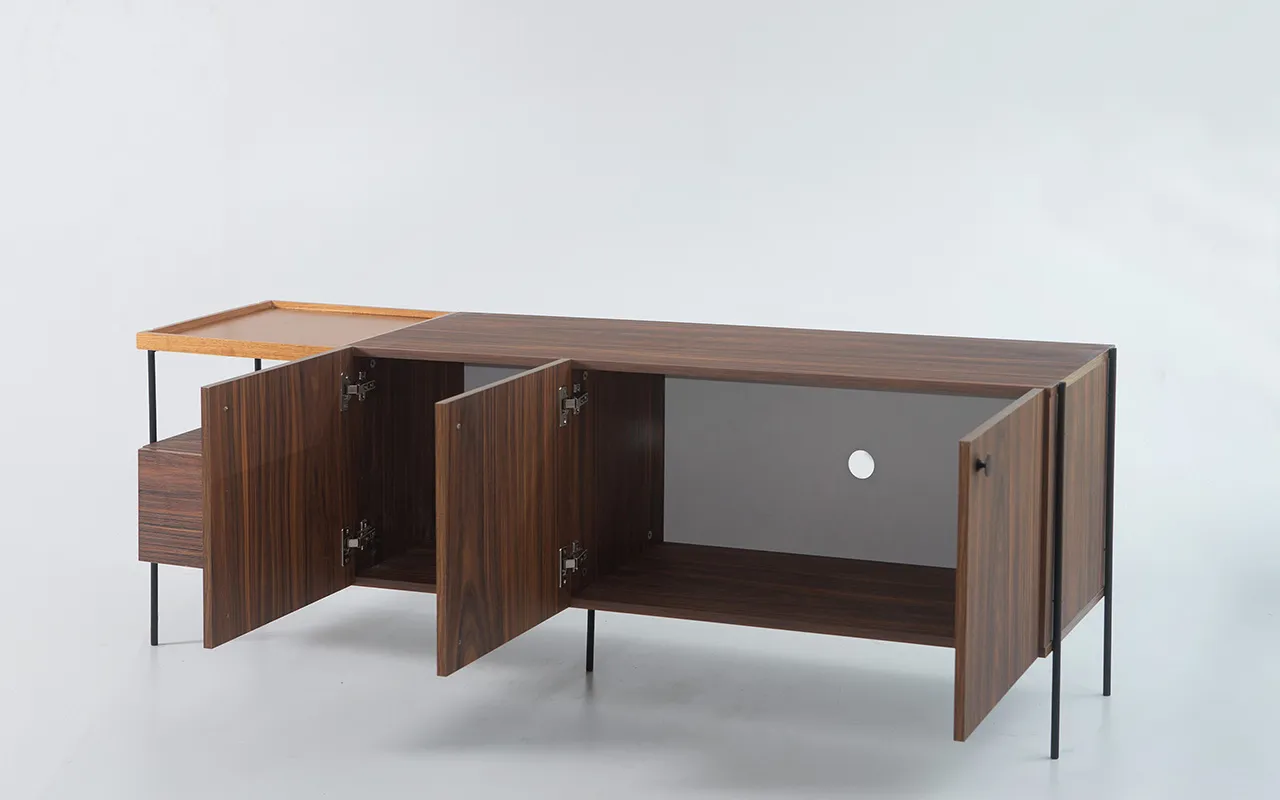 Os pés de aço carbono redondo de 13mm, com pintura epóxi preta, conferem estabilidade e um toque contemporâneo. As dobradiças das portas são de excelente qualidade e vêm com amortecimento para um fechamento suave.