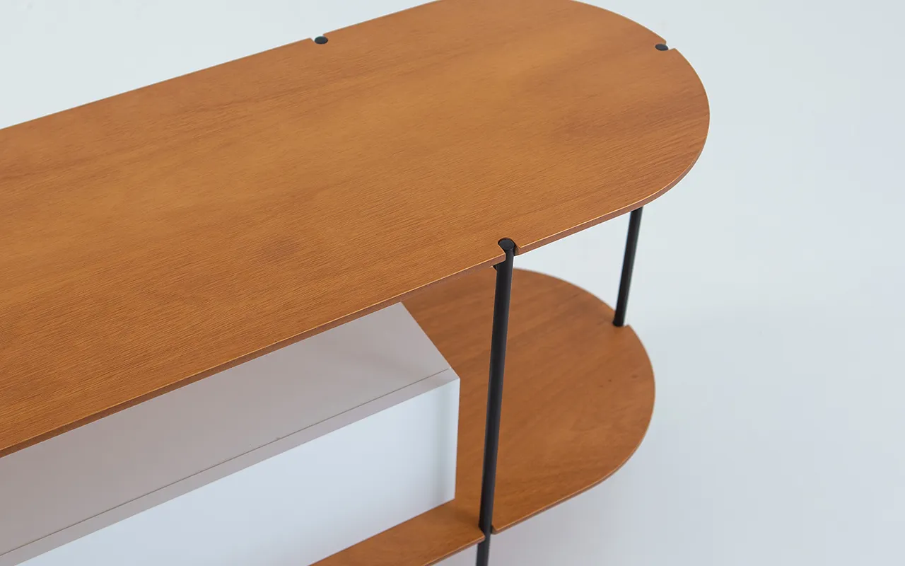 Nas extremidades, apoios laterais arredondados ampliam a área útil e permitem composições decorativas com livros, esculturas ou objetos, reforçando o caráter de design autoral da peça.
