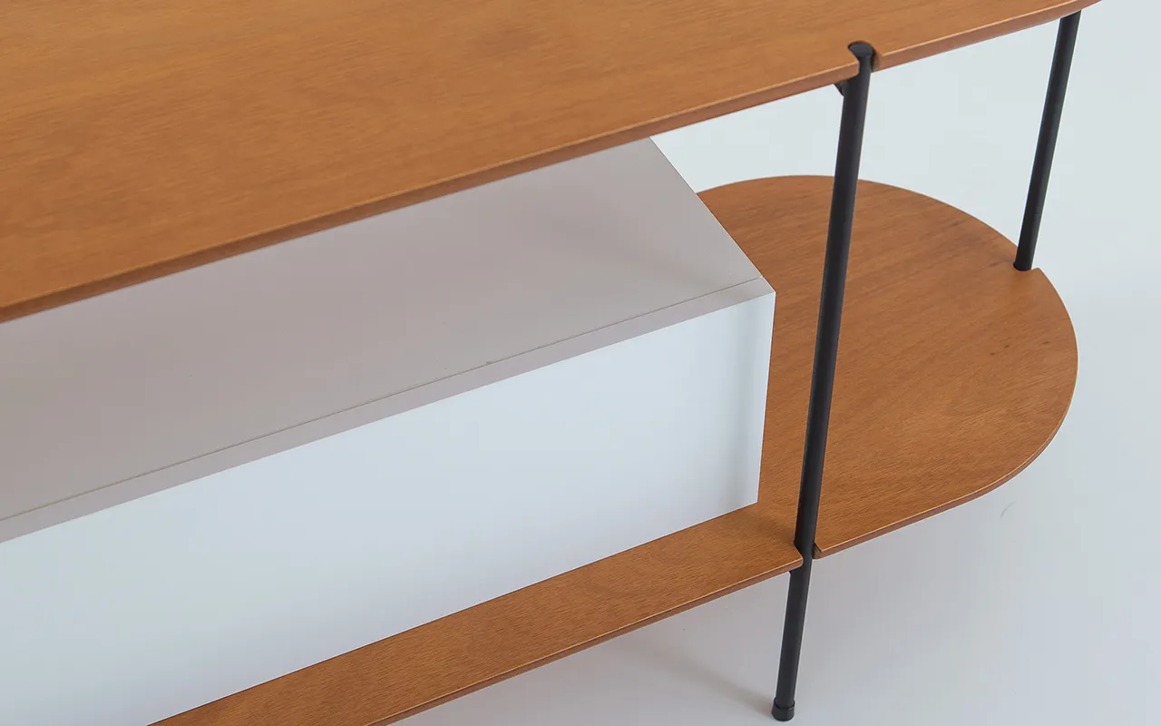 A estrutura inferior é produzida 100% em MDF revestido com melamina de altíssima resistência, material amplamente utilizado em móveis planejados de alto padrão, reconhecido por sua estabilidade, resistência e excelente acabamento. O contraste entre o corpo e o tampo em madeira natural cria profundidade visual e reforça a sofisticação da peça.