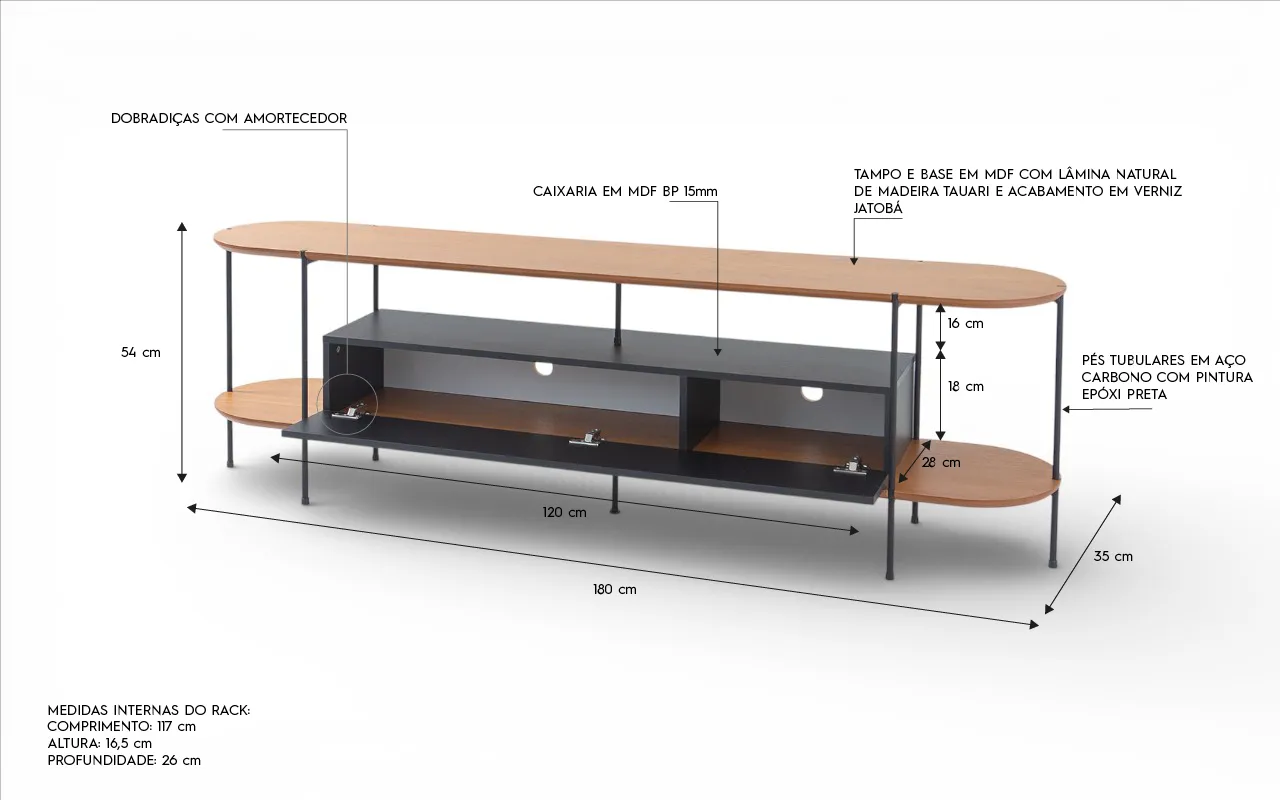 Projetado para o uso cotidiano, o rack possui nichos internos e compartimentos com porta basculante, ideal para acomodar eletrônicos, aparelhos, controles, cabos e objetos decorativos de forma organizada. Os compartimentos contam com passa-fios estratégicos, facilitando a instalação de equipamentos sem comprometer o visual limpo do móvel.