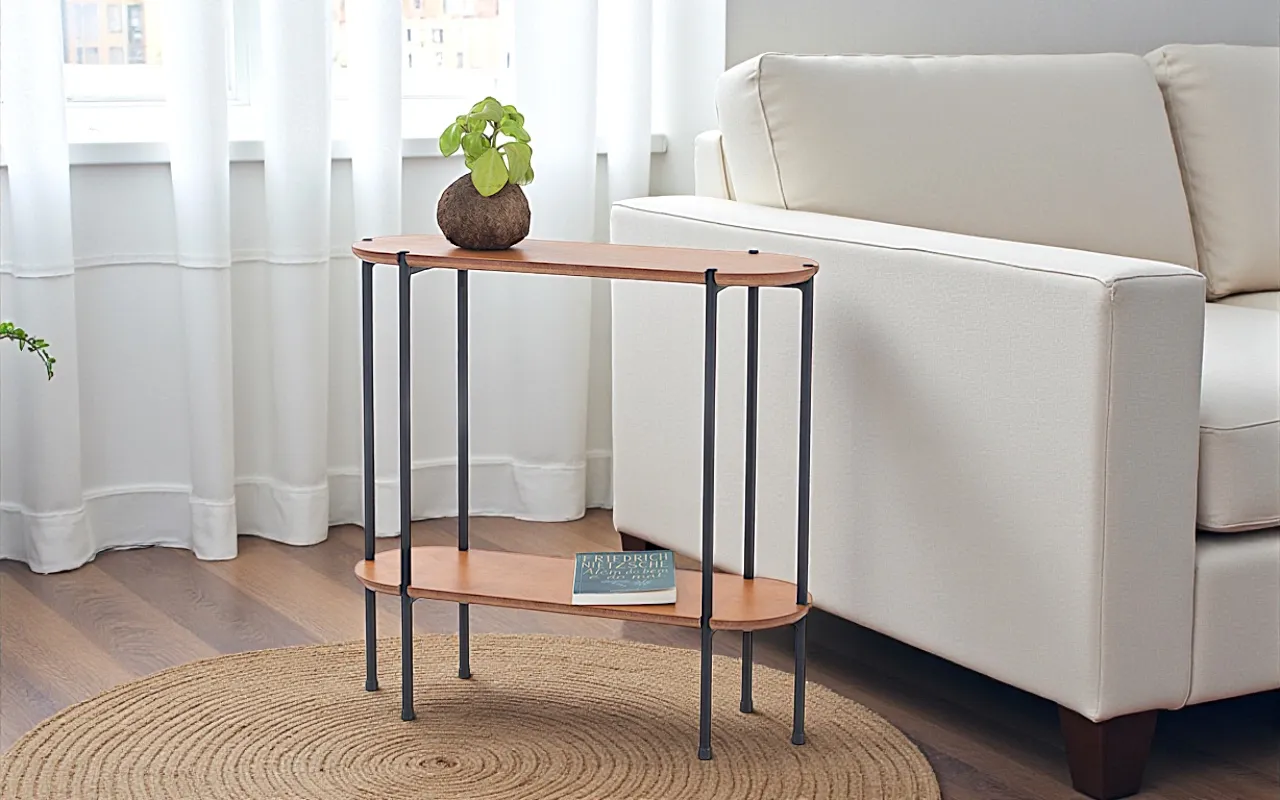 Seu formato retangular permite encaixe próximo ao sofá ou