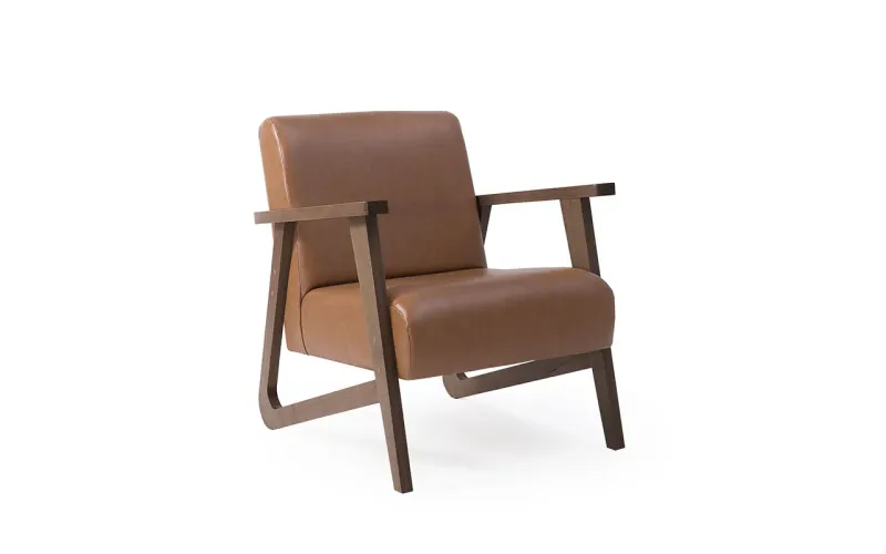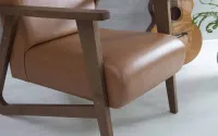 A poltrona de madeira Lis tem a tapeçaria composta por um tecido de couro sintético, 90% poliéster, garantindo o charme do aspecto do couro e também uma grande facilidade de limpeza.