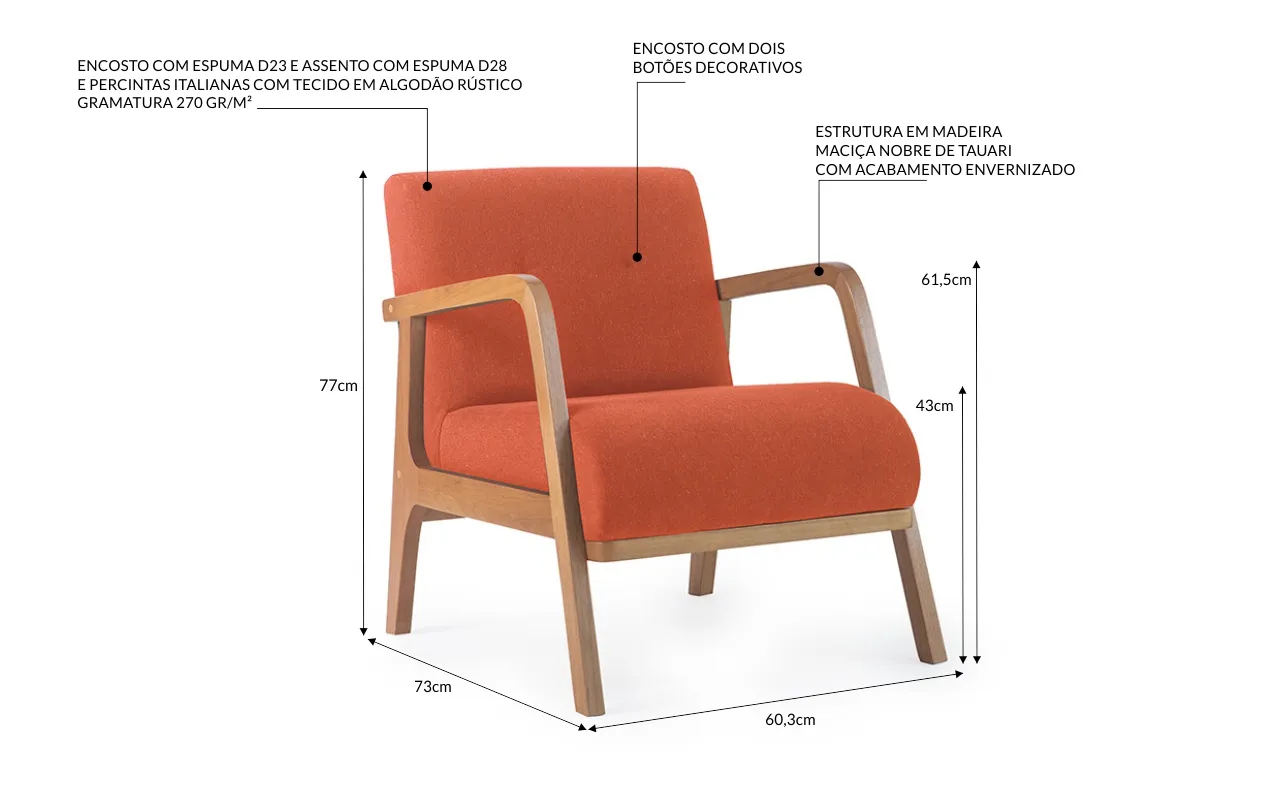 A poltrona para sala Alfazema é uma poltrona robusta, com medidas ótimas para um descanso repleto de conforto, sendo 60,3cm de largura, 73cm de profundidade e 77cm de altura total (confira o detalhamento nas imagens).