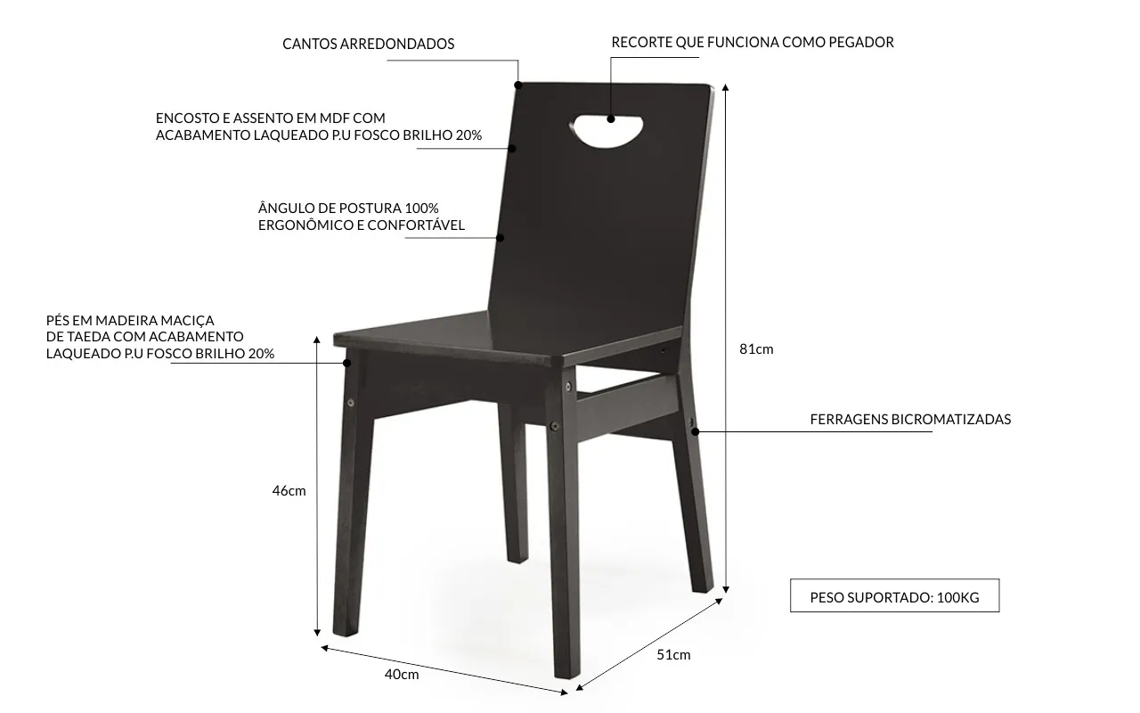 Ah! A cadeira de madeira para cozinha Tucupi é fabricada com madeira maciça de Taeda + MDF (Nada de aglomerados!!!), suporta até 100Kg e será entregue desmontada, acompanhada de manual de montagem super fácil.