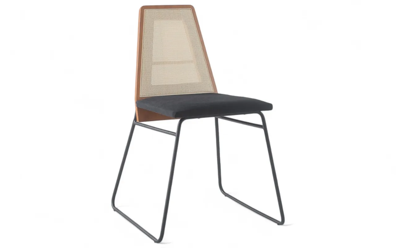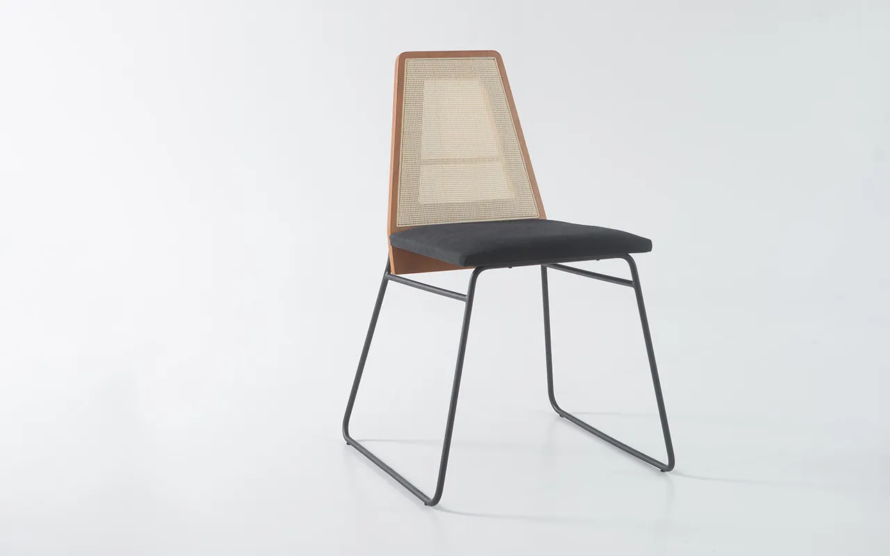 A partir de uma mesma base de metal criamos várias opções de encostos, tecidos e tonalidades amadeiradas que resultaram numa cadeira de metal moderna e cheia de versatilidade!