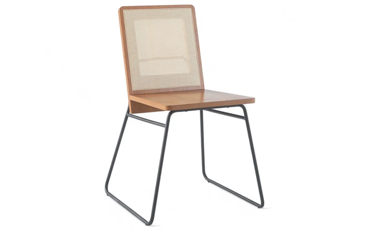 A partir de uma mesma base de metal criamos várias opções de encostos, tecidos e tonalidades amadeiradas que resultaram numa cadeira de metal moderna e cheia de versatilidade!