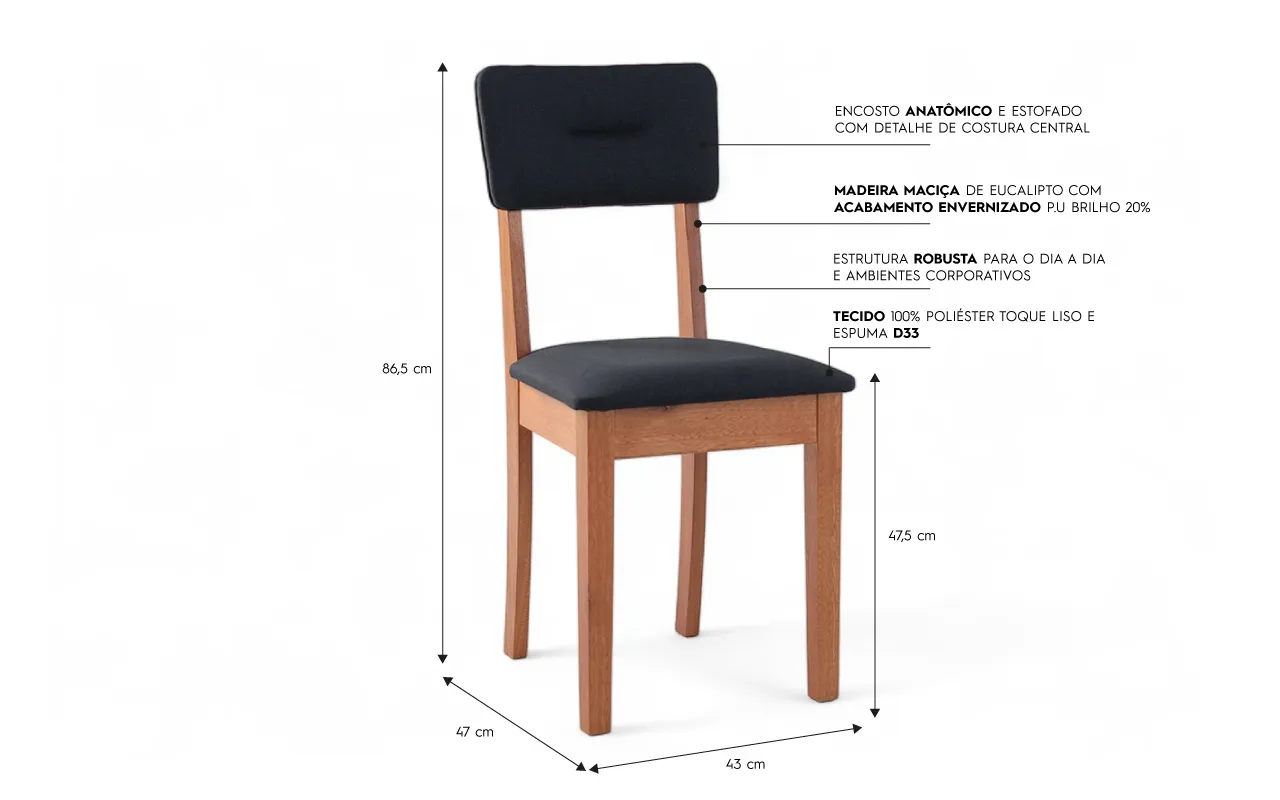 CADEIRA ESTOFADA PARA SALA DE JANTAR CIMA VERNIZ JATOBÁ E TEC.004 PRETO 43X47X86,5 CM