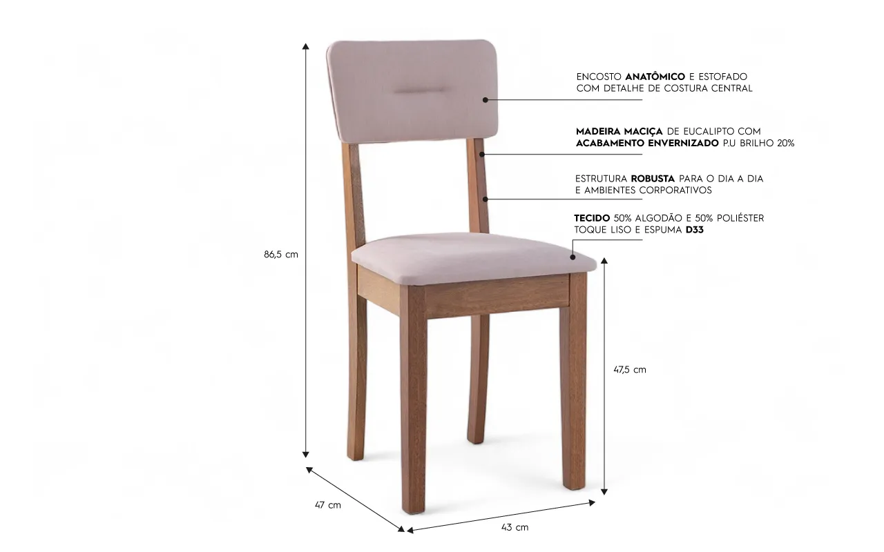 Com um design bastante clássico, a cadeira Cima foi escolhida por nossa curadoria por possuir qualidade e resistência, mas é claro que não poderíamos deixar de colocar um pouco mais de charme nela com o assento e encosto estofados.