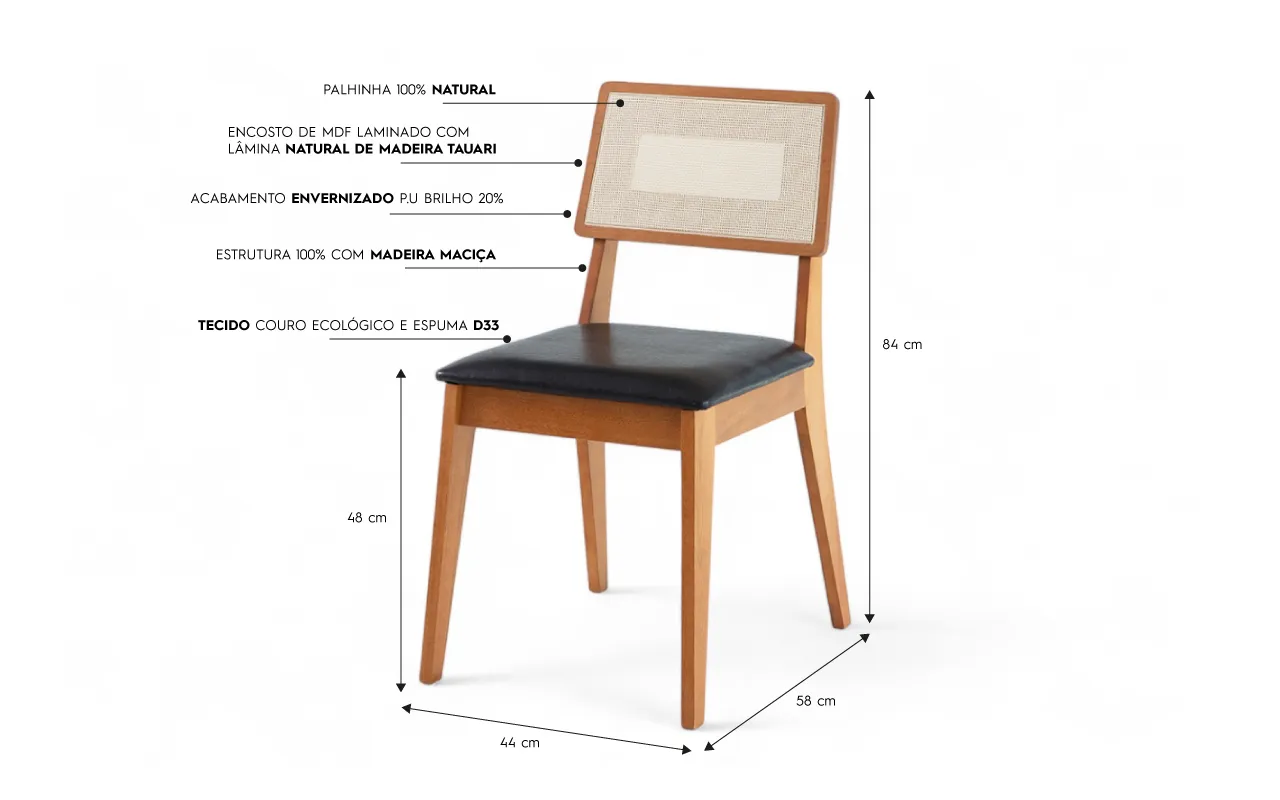 Sua estrutura é fabricada com madeira maciça de eucalipto, o encosto é feito com lâmina natural de tauari e possui aplicação de palhinha que é 100% natural (nada de materiais sintéticos, ein!)