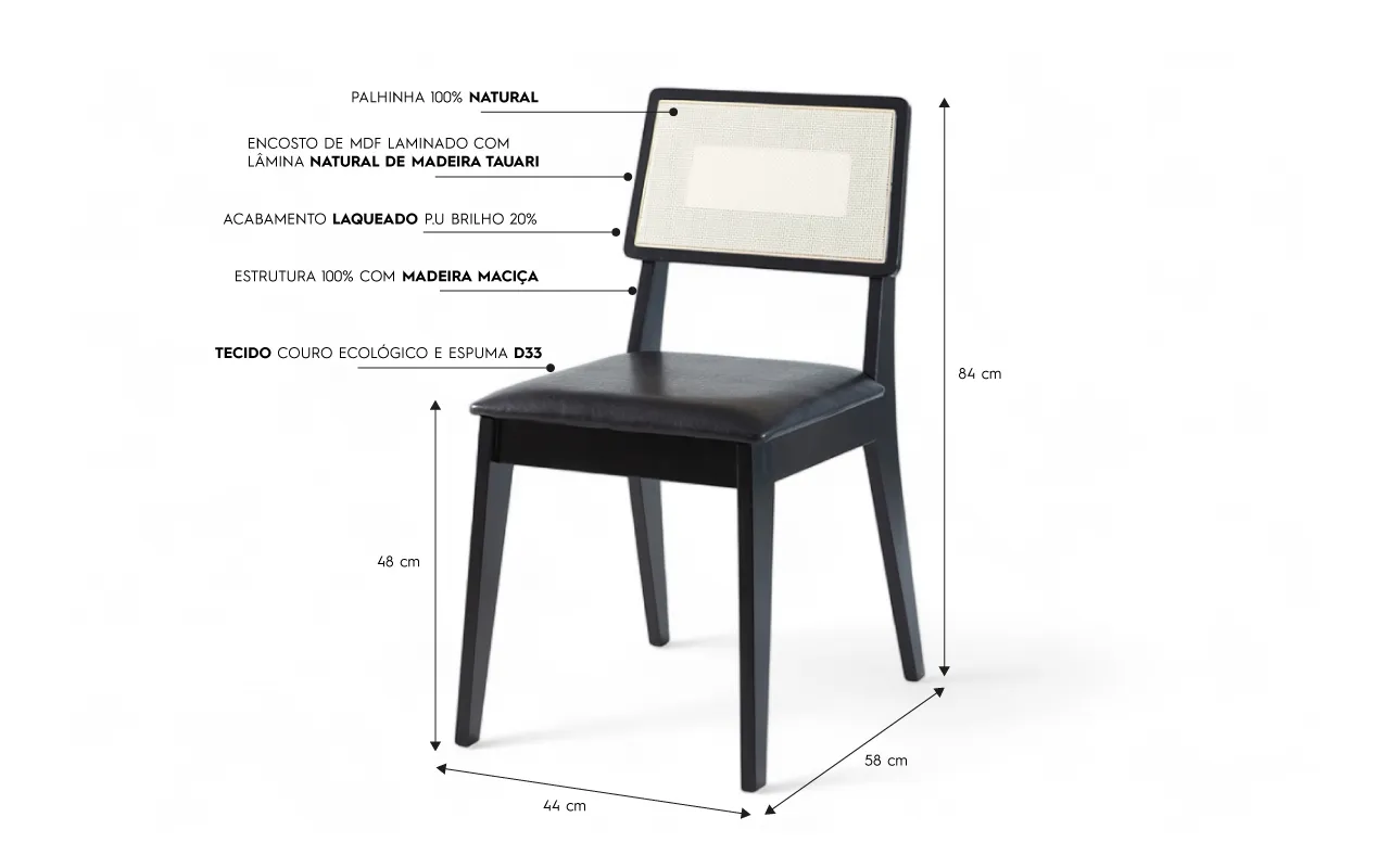 Sua estrutura é fabricada com madeira maciça de eucalipto, o encosto é feito com lâmina natural de tauari e possui aplicação de palhinha que é 100% natural (nada de materiais sintéticos, ein!)