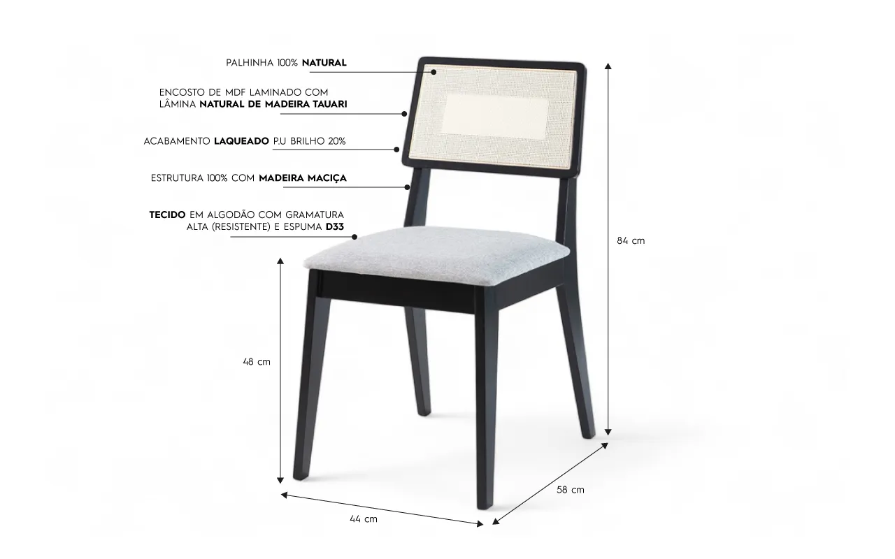 Sua estrutura é fabricada com madeira maciça de eucalipto, o encosto é feito com lâmina natural de tauari e possui aplicação de palhinha que é 100% natural (nada de materiais sintéticos, ein!)