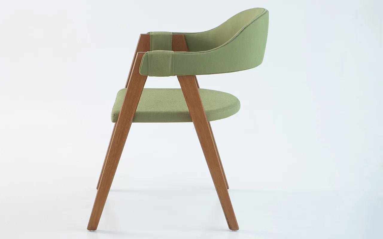 O grande destaque é o encosto anatômico em formato de concha, cuidadosamente estofado tanto na parte interna quanto na parte externa, com acabamento refinado nas bordas. Esse design abraça o corpo e proporciona uma experiência de conforto única. Os braços também recebem revestimento no mesmo tecido, oferecendo maciez e aconchego ao toque.
